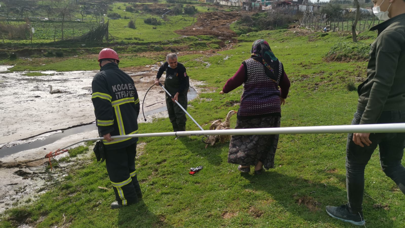 Çamurla kaplı alanda mahsur kalan ve hareket edemeyen kazları, kendi imkanıyla kurtaramayan Yavuz, itfaiye ekiplerine haber verdi.