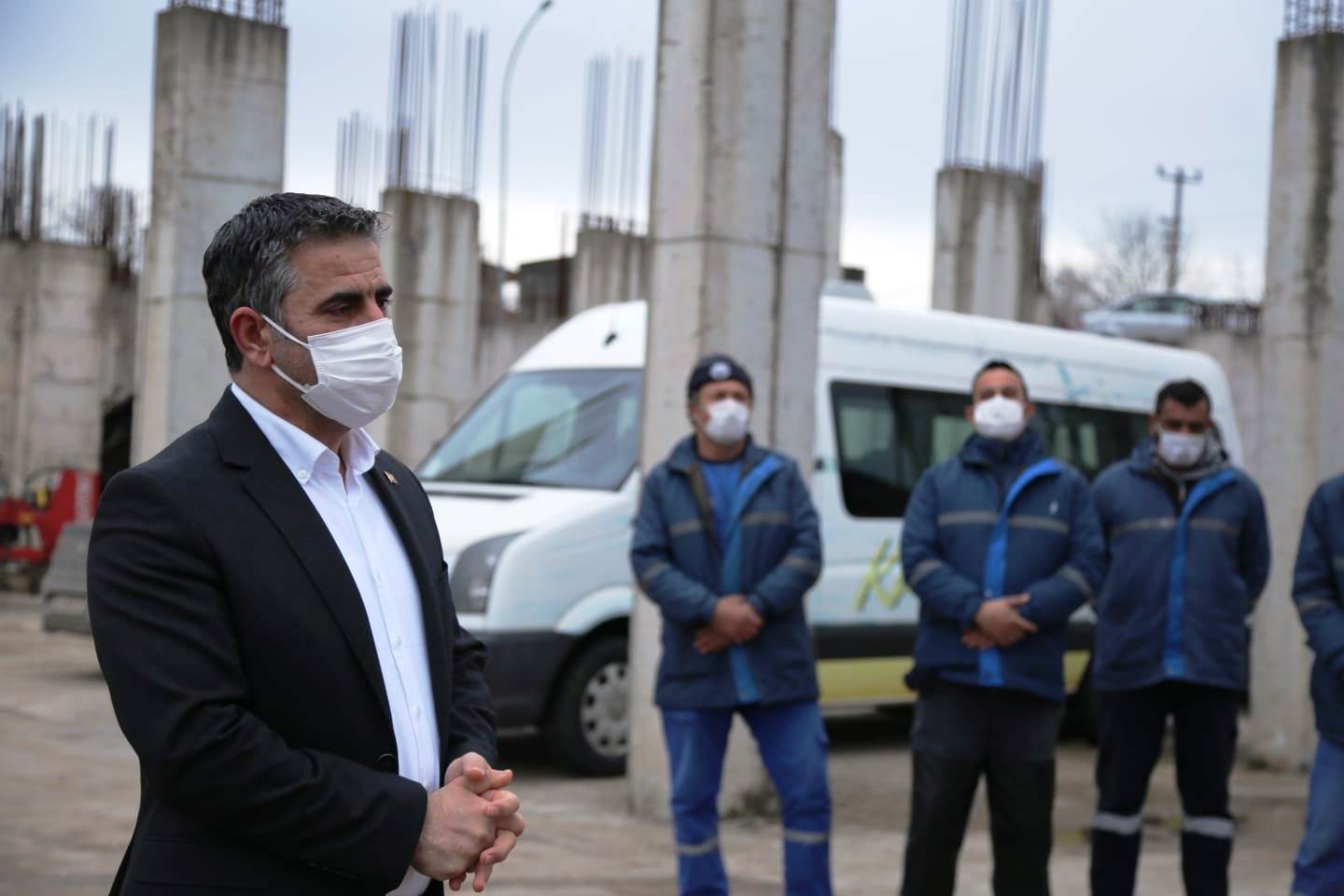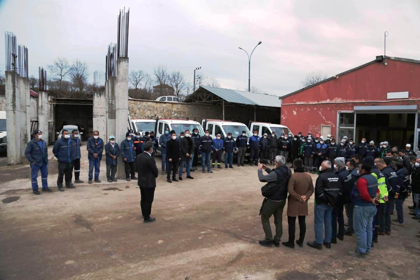 İş dağıtımı öncesi Garaj Amirliği'ni ziyaret eden Belediye Başkanı Turan, yağış sırasında sahada Fen İşleri ve Temizlik İşleri Müdürlüğü bünyesinde görev yapan personele özverili çalışmalarından dolayı teşekkür etti.