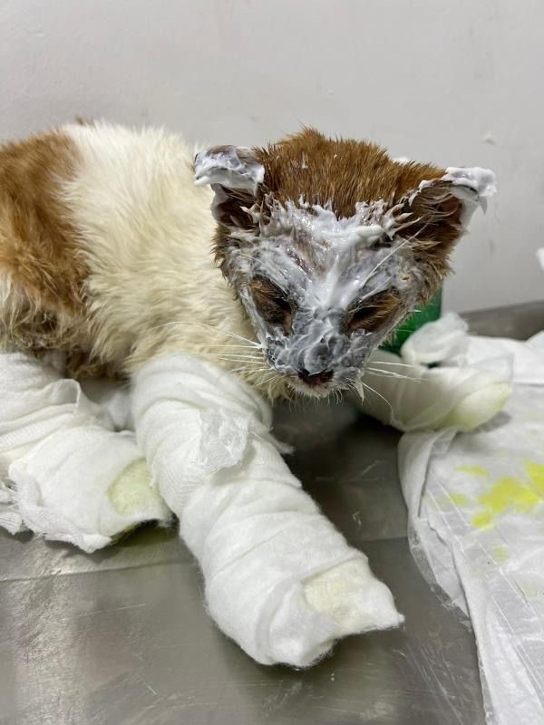 Kediyi beyaz ve yapışkan bir kimyasaldan arındırarak tedavi altına aldıklarını belirten Anaç, “Hasar vücudun sağ tarafından oluşmuş. Çünkü sol iki bacak daha inik ve daha az ödemliyken sağ taraf daha ödemli ve şiş. Sağ tarafında damar dolaşımı daha çok bozulmuş durumda. Vücudun sağ bölgesinden bir kimyasala girdiğini düşünüyoruz. Beyaz yapışkan bir kimyasaldı. Yıkadık ve çıkardık. Yüzünden, vücudundan arındırdık. Sadece yara bölgelerindeki hasarlarla uğraşıyoruz. Genel psikolojik durumumuz daha iyi. Hayati tehlike bugün de biraz var. Fakat tedavilerimize güzel bir cevap verdiği için, ufak ufak sıvı mamalarla beslenmeye cevap verdiği için hayati tehlike daha da azalıyor” diye konuştu.