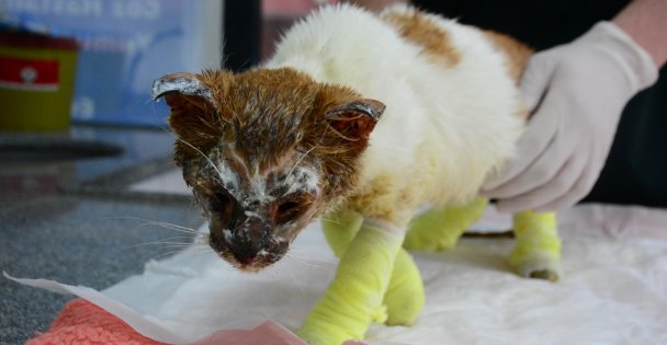 Kocaeli’nin Körfez ilçesinde bulunan bir fabrikada, asit ve kostik maddelere bulaşan kedi ağır yaralandı. Vücudunda ikinci ve üçüncü derece yanıklar oluşan kedi, durumunun fark edilmesi üzerine veterinere götürüldü. Yüz bölgesinde yanıklar olduğu görülen kedi, görmekte ve koku almakta güçlük yaşıyor. Deri ve tüy bütünlüğünde de bozulmalar olan kedinin yanıktan dolayı bacaklarında da şişme ve ödem meydana geldi. Veteriner Hekim Ali Anaç tarafından tedavi altına alınan kedinin beyaz ve yapışkan bir kimyasal maddeden arındırıldığı öğrenildi. Fabrika bölgesinde asit ve kostike bulaşan kedinin tedavilere olumlu cevap verdiği ve durumunun iyiye gittiği belirtildi. Minik kedinin görüntülenen yaralı hali ise görenlerin içini acıttı.