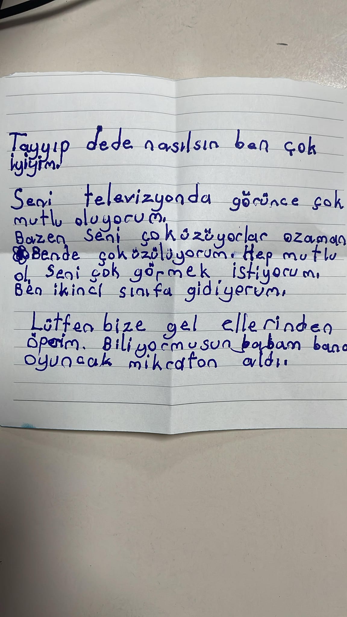 Mektupta Zeynep Erva Şen, duygularını sade ve samimi bir şekilde dile getirerek Cumhurbaşkanına seslendi: “Tayyip dede. Nasılsın, ben çok iyiyim. Seni televizyonda görünce çok mutlu oluyorum. Bazen seni çok üzüyorlar, o zaman ben de çok üzülüyorum. Hep mutlu ol. Seni çok görmek istiyorum. Ben ikinci sınıfa gidiyorum. Lütfen bize gel. Ellerinden öperim. Biliyor musun babam bana oyuncak mikrofon aldı.”