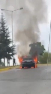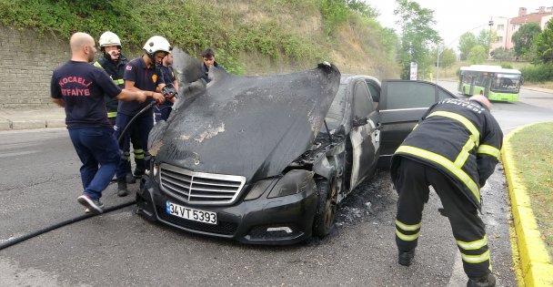 İzmit ilçesinde arıza sebebiyle test sürüşüne çıkartılan lüks otomobilde seyir halindeyken yangın çıktı. Alev alev yanan otomobil kullanılamaz hale geldi.