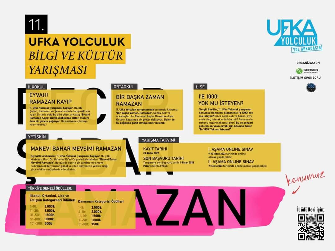 Her yıl farklı konularda gerçekleştirilen Ufka Yolculuk Bilgi ve Kültür Yarışmaları, bu yıl on bir ayın sultanı “Ramazan” temasıyla ilkokul, ortaokul, lise ve yetişkin düzeyinde 4 farklı kategoride düzenleniyor.