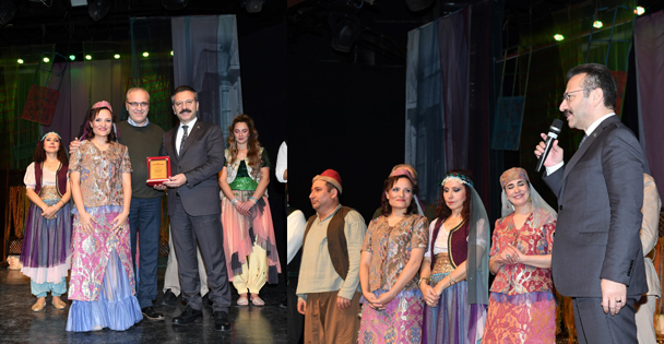 Yönetmen Kadir Yüksel, tiyatro oyununun ardından Valimiz Sayın Hüseyin Aksoy’a teşriflerinden dolayı teşekkür ederek, plaket takdiminde bulundu.