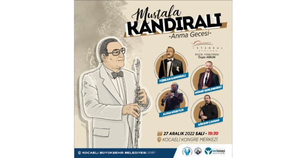Kocaeli Büyükşehir Belediyesi, Türk klarnetini dünyaya duyuran usta sanatçı Mustafa Kandıralı’yı vefatının 2. yılında düzenleyeceği bir programla anacak. Anma programına Mustafa Kandıralı ekolünün önde gelen klarnet sanatçılarından Türkan Kandıralı, Altan Gözetlik, Göksun Çavdar ve Hüsnü Şenlendirici katılacak.