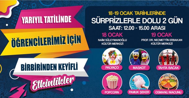 Yarıyıl etkinlikleri kapsamında palyaço, maskot ve tahta bacak gösterilerinin yanında tiyatrolar, sinemalarda izleyicileriyle buluşacak. 17 Ocak Cuma günü itibariyle başlayacak olan yarıyıl tatilinin ilk etkinliği 18 Ocak Cumartesi Naim Süleymanoğlu Kültür Merkezi’nde 13.00 ile 15.00 saatlerinde 2 seans olarak Bitmeyen Tatil isimli çocuk tiyatrosu ile başlayacak. 19 Ocak Pazar günü ise Aliş’in Maceraları adlı çocuk tiyatrosu Prof. Dr. Necmettin Erbakan Kültür Merkezi’nde yine 13.00-15.00 saatlerinde sahne alacak.