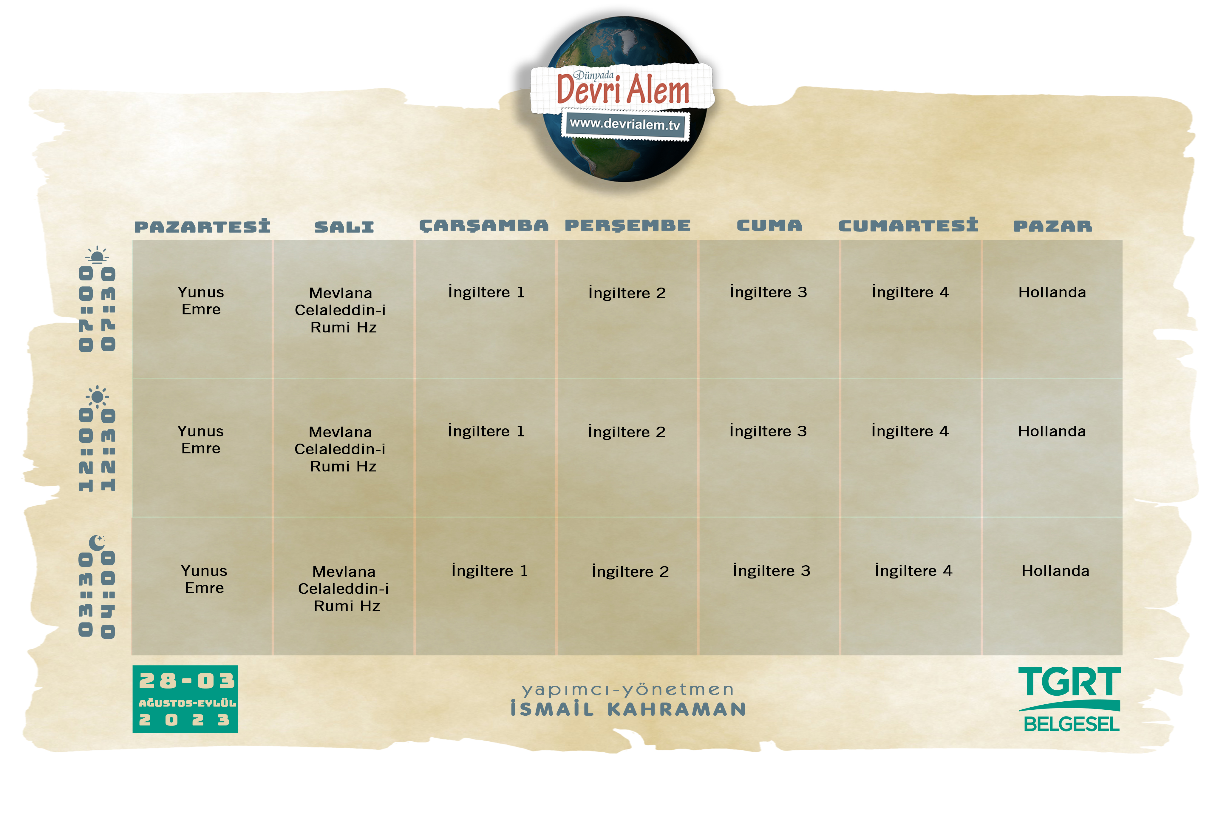 Sabah 07:00-07:30, öğlen 12:00-12:30 ve gece 03:30-04:00 olmak üzere her gün, günde üç defa TGRT Belgesel ekranlarında olan Devri Alem belgesel programı 28Ağustos - 03 Eylül haftasında yine TGRT ekranlarında olacak.