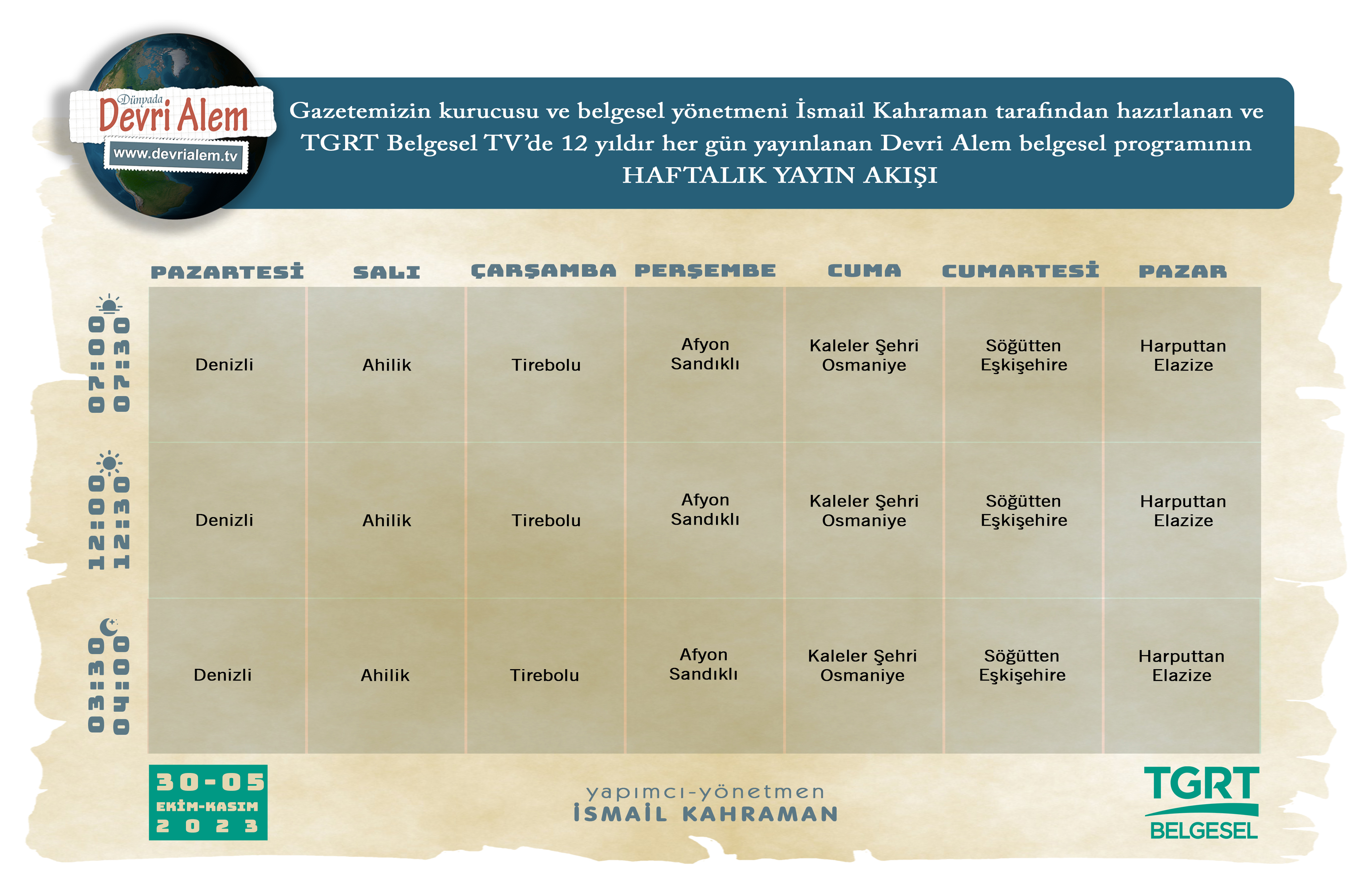 Sabah 07:00-07:30, öğlen 12:00-12:30 ve gece 03:30-04:00 olmak üzere her gün, günde üç defa TGRT Belgesel ekranlarında olan Devri Alem belgesel programı 30 Ekim-5 Kasım haftasında yine TGRT ekranlarında olacak.