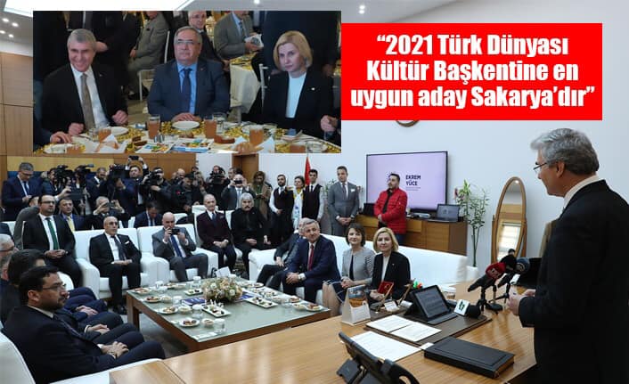 Sakarya’nın tarım, sanayi, turizm, fiziki ve coğrafi konumuna ilişkin bilgiler paylaşan Başkan Yüce, “Sakarya’mız 72 milletten insanın bir arada yaşadığı çok kültürlü bir şehir. Geniş gönül coğrafyamız için hem batıda hem de doğuda köprü vazifesi gören bir altyapıya sahip. Bu bilinçle Sakarya’da bütün Türk boylarının dönemsel olarak yer alacağı bir kültür köyü inşa edeceğiz. Köyde her aile bahçe içinde geniş bir eve sahip olacak. Köyün meydanına da bir pazar kurularak her türlü kültür alışverişi bu pazarda gerçekleştirilebilecek. Şehrimiz kültürel zenginliği yanı sıra iklimiyle, yetiştirilen farklı ürünleriyle, havasıyla, doğasıyla, kültür çeşitliliğiyle, gelişen sanayi ve turizm olanaklarımız mevcut. Yeşili ve mavisi, denizi, gölü, longozu, kaplıcaları ile ülkemizin göz bebeği şehirlerinden birisi. Bu nedenle 2012 yılından beri uygulanan Türk Dünyası Kültür Başkentine 2021 yılı için adayız. Sakarya’nın kozmopolit yapısı bizi Türk Dünyası Kültür Başkentine en uygun aday konumuna getiriyor” dedi.