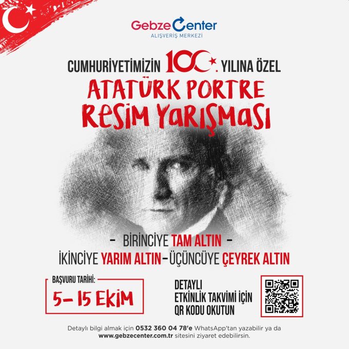 Cumhuriyet’in 100’üncü Yılı Karakalem Resim Yarışması’na katılmak için Gebze Center danışma bankosuna şahsen müracaat edilmesi gerekiyor. Yarışma’nın 1. etap elemelerinde başarılı olan eserler 2 -7 Kasım tarihinde Gebze Center’ın sosyal medya hesaplarından oylamaya sunulacak. Sosyal medya oylaması ve jüri değerlendirmesi neticesinde dereceye giren eserlerden birincinin tam, ikincinin yarım, üçüncünün çeyrek altın kazanacağı yarışmanın ödül töreni ise 11 Kasım’da Genze Center etkinlik alanında yapılacak.