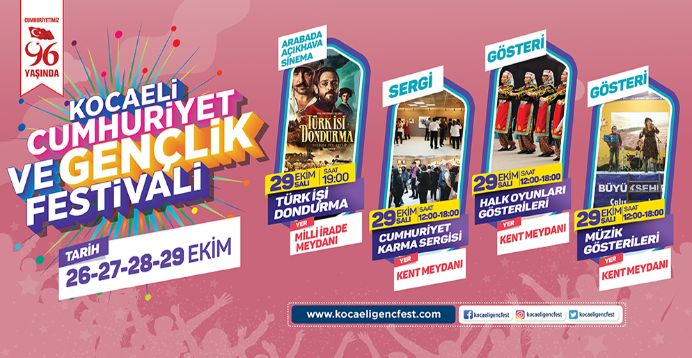 Kocaeli Büyükşehir Belediyesi, 26-29 Ekim tarihleri arasında Kocaeli’nin birçok merkezinde birbirinden farklı etkinliklerle 29 Ekim Cumhuriyet Bayramı’nın 96’ıncı yılı kutlamalarına coşku ve anlam katmak için ‘’Kocaeli Cumhuriyet ve Gençlik Festivali’’ düzenleyecek. Lise ve üniversite gençliğinin yer alacağı festivalde etkinlikler, gösteriler, tanınmış sanatçılar ve konserler yer alacak. Gençlik ve Spor Hizmetleri Dairesi Başkanlığı ile Şube Müdürlükleri koordinasyonunda bu yıl ikincisi düzenlenen festivale, katılımın yoğun olması bekleniyor.