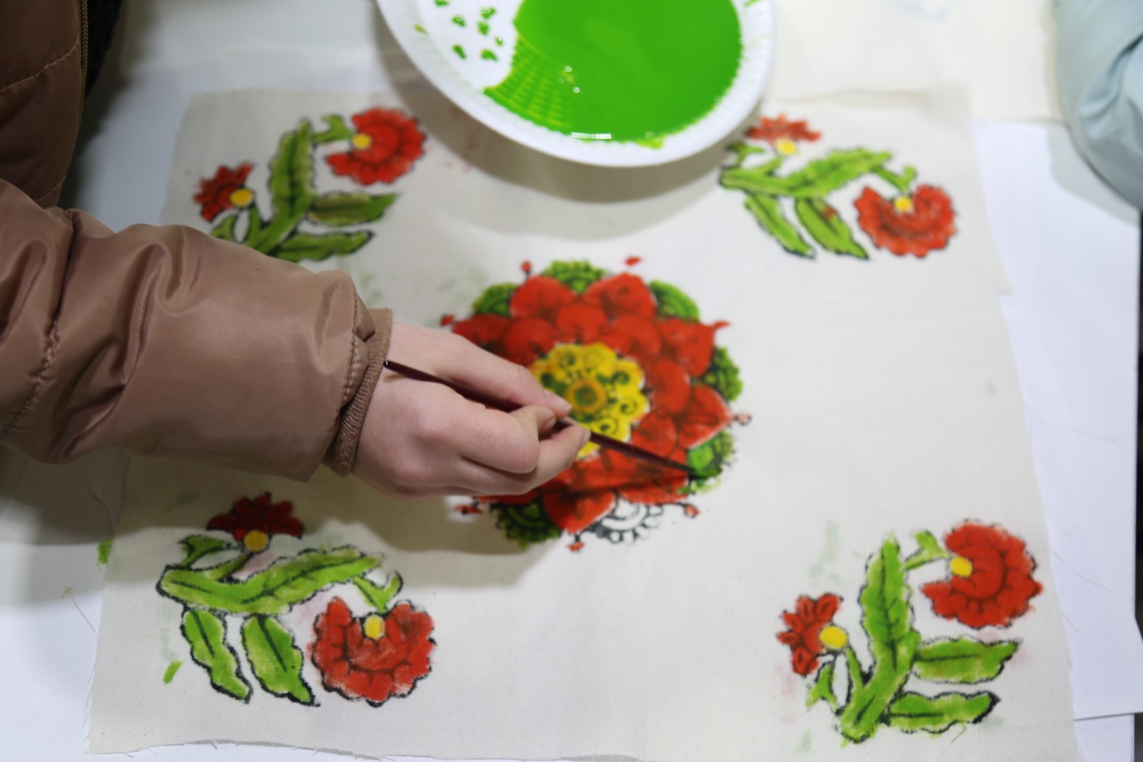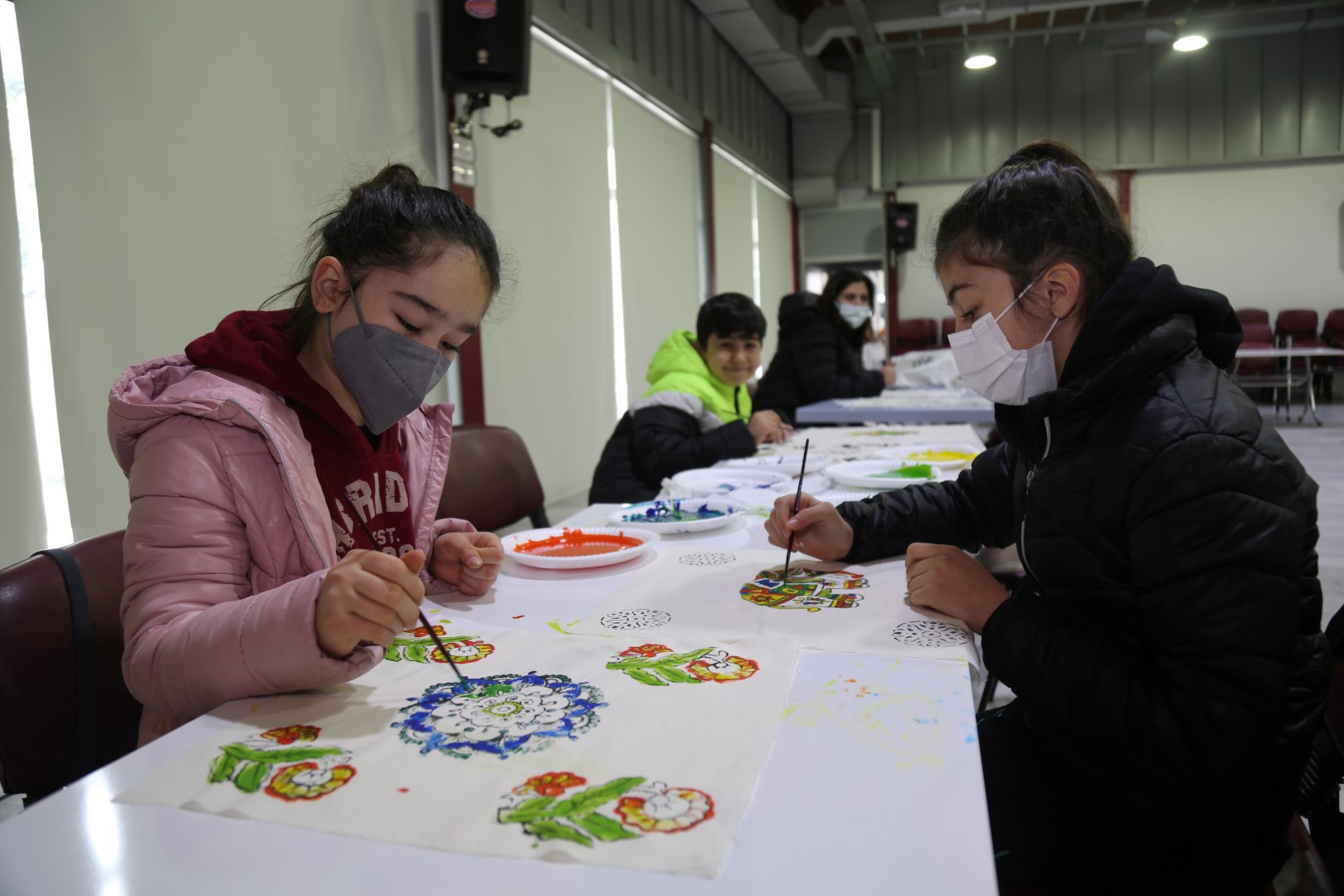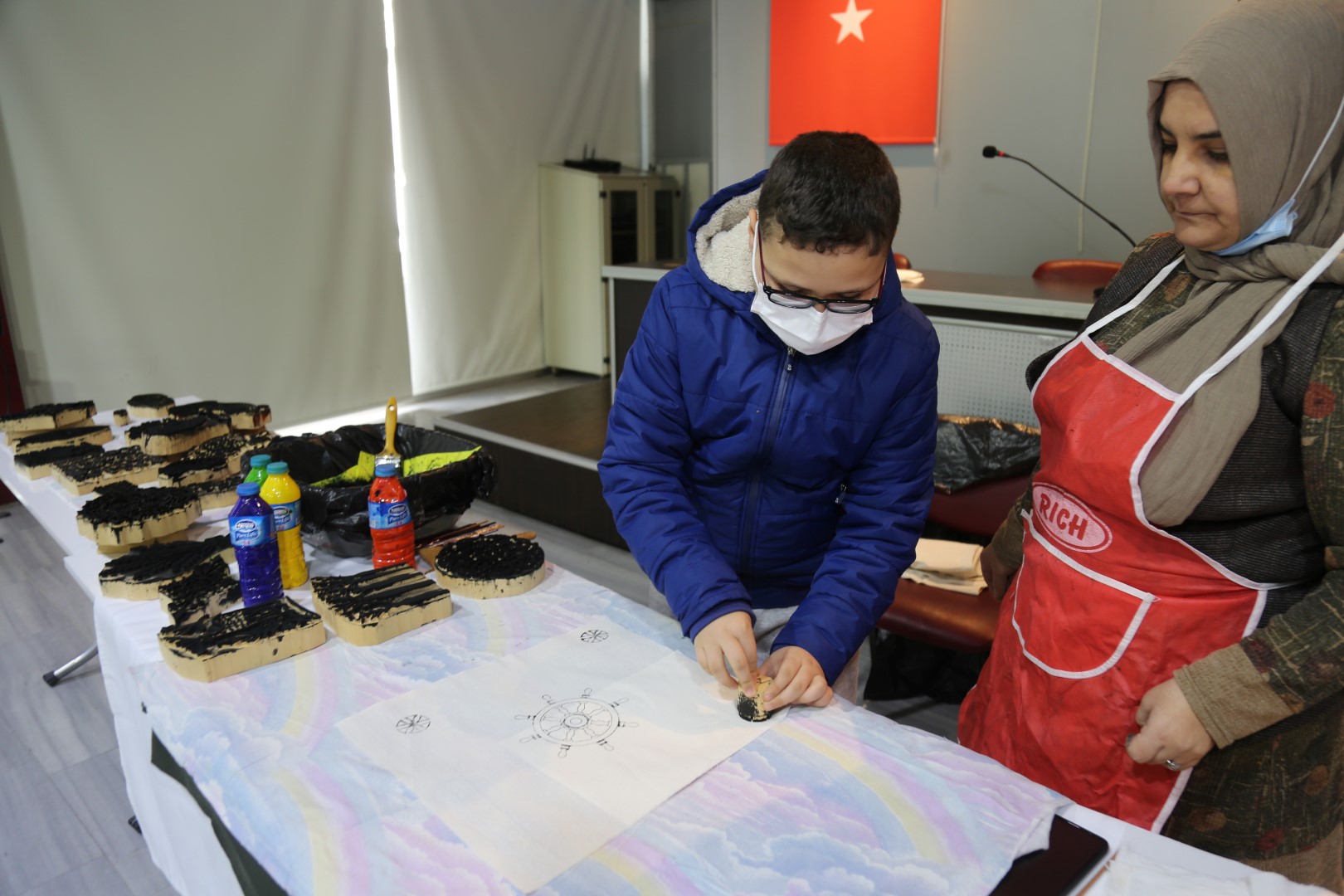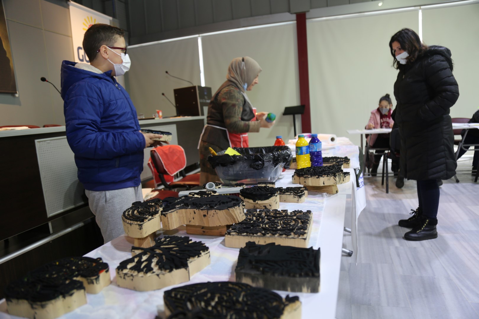 Sabah saatlerinde atölyeye gelen öğrenciler, tahta kalıplara oyulan desenleri; geleneksel yöntemlerle üretilen kök boyalarla renklendirerek ellerindeki kumaşlara baskı yaptılar. Zaman zaman velilerinin de eşlik ettikleri atölyede öğrenciler, yaptıkları baskıları yine kök boyalarla renklendirerek birbirinden güzel desenlerle süslenmiş kumaş parçaları ortaya çıkardılar.