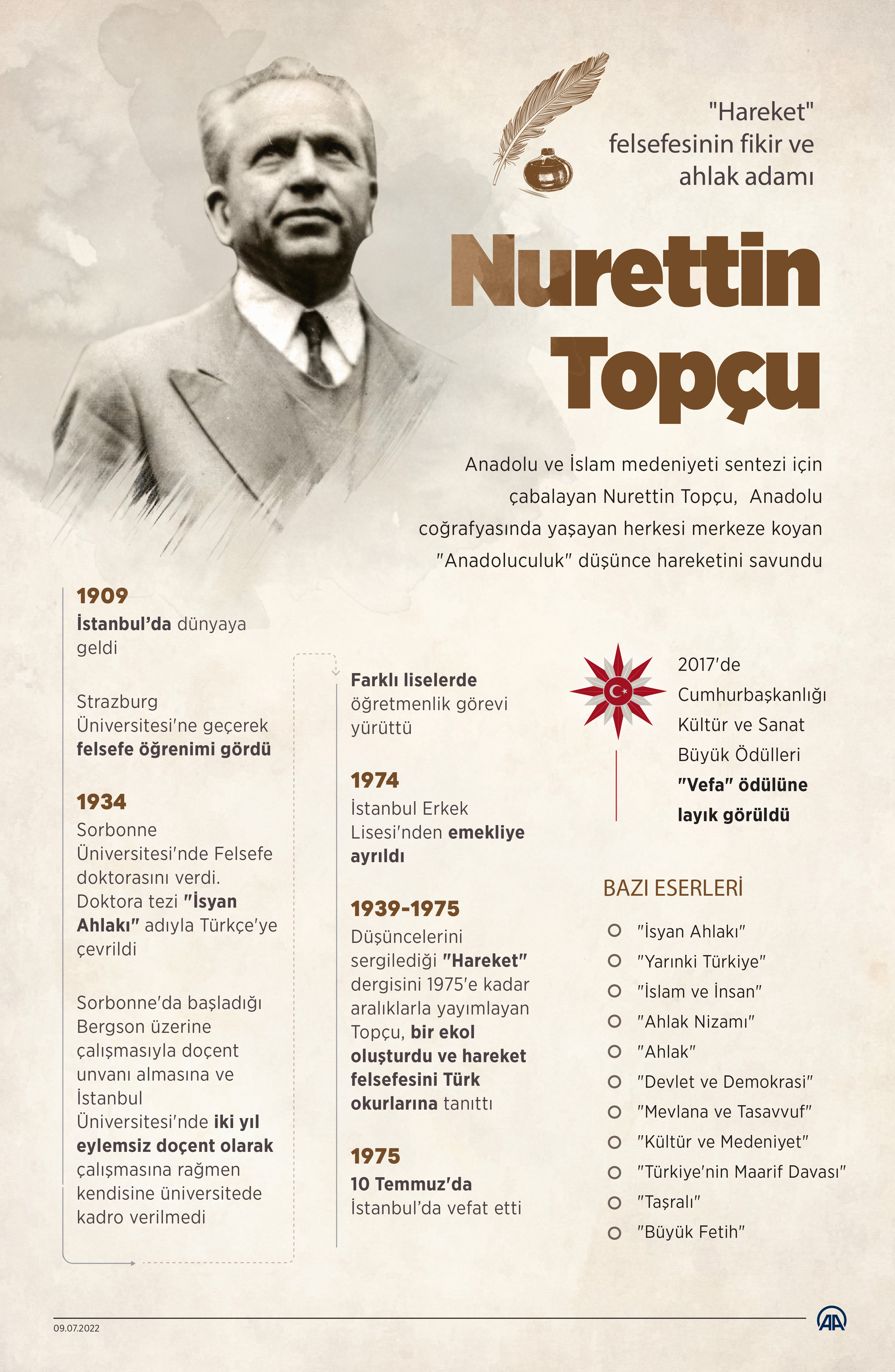 Anadolu ve İslam medeniyeti sentezi için çabalayan, "Hareket" dergisinin kurucusu, sosyolog, felsefeci, yazar ve öğretmen Nurettin Topçu'nun vefatının üzerinden 47 yıl geçti.