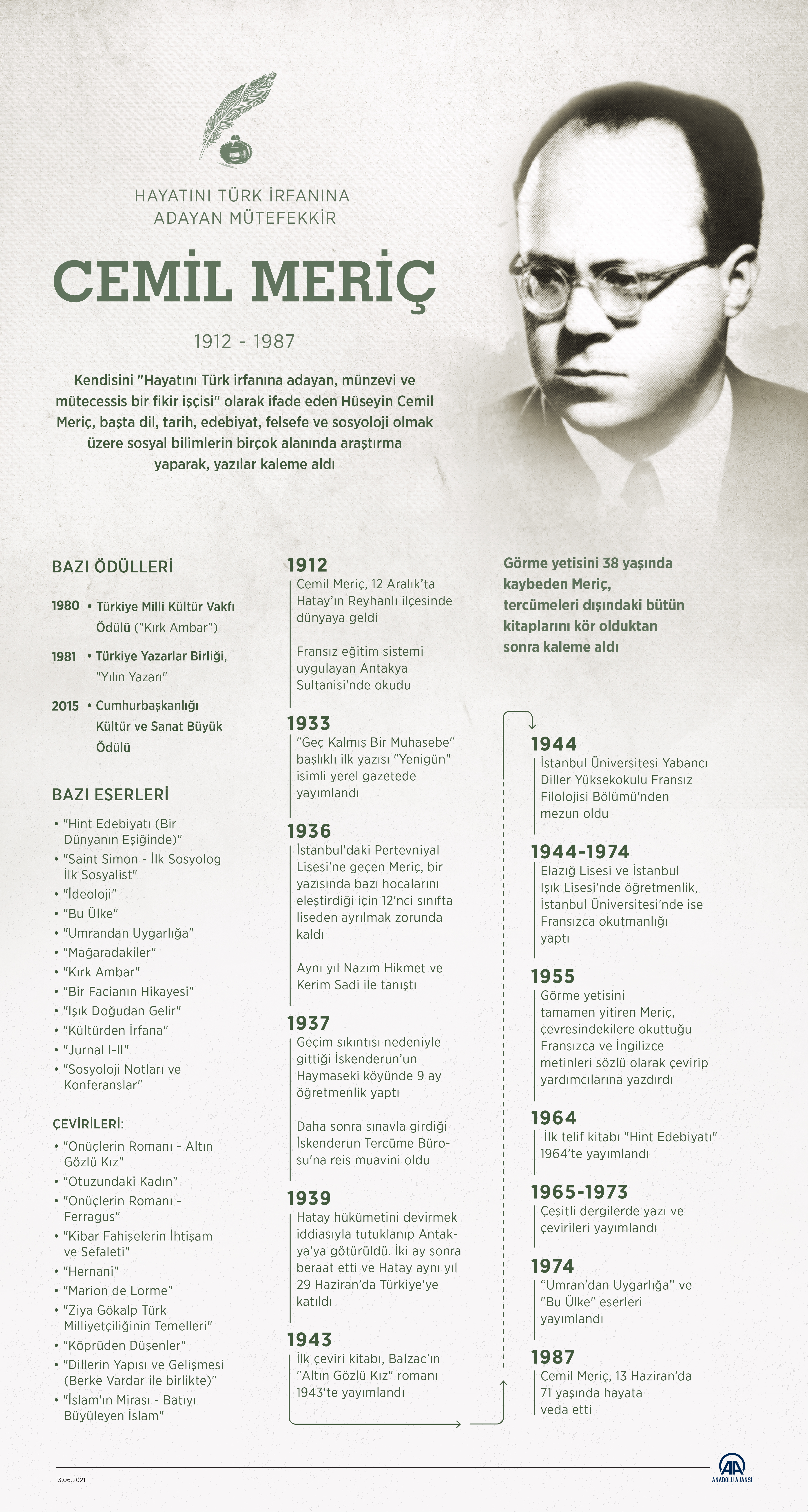 "Kimim ben?" sorusuna "Hayatını Türk irfanına adayan münzevi ve mütecessis fikir işçisi" cevabını veren yazar, çevirmen ve mütefekkir Cemil Meriç'in vefatının üzerinden 34 yıl geçti.