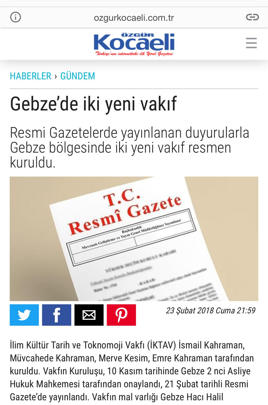Vakfımıza ait araştırma merkezi kütüphanesini kültür bakanlığına tescil ettirdik. Açılışına Gebze Kaymakamı Mustafa Güler, Gebze Belediye Başkanı Zinnur Büyükgöz, Kocaeli Kültür Turizm Müdürü Ercan Yamen ve diğer yetkililer katılmış, konuşmalar yapmışlardı. İKTAV Vakfımız Devlet ve Milletimize hayırlı olsun. Vakfın özel araştırma kütüphanesi ile ilgili belgesel programı sizlerle paylaşıyoruz https://www.youtube.com/watch?v=FI-XNuMuOLQ