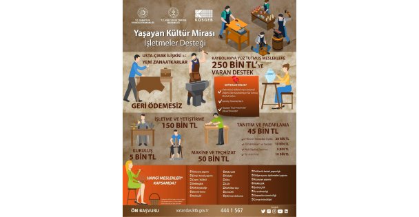 Destek paketinden ise takunya yapımı, şimşir tarak yapımı, Çeşm-i Bülbül, Debbağlık, kök boyacılığı, dantel örme, hallaçlık, bakırcılık, telkâri, oltu, lüle, kehribar taşı, çinicilik, şile bezi dokunma, folklorik bebek yapıcılığı, gölge oyunu tiplemeleri yapımı, kazaziye yapımı, nakkaşlık, şerbetçiler, at arabacılığı, gramofon tamirciliği ve çorap örücülüğü meslekleri yararlanacak. Kaybolmaya Yüz Tutmuş Mesleklere 250 bin TL'ye varan destek ile ilgili ise başvurular 22 Temmuz 2022 tarihine kadar Kültür ve Turizm Bakanlığı Araştırma ve Eğitim Genel Müdürlüğüne veya www.vatandas.ktb.gov.tr adresine yapılacak.