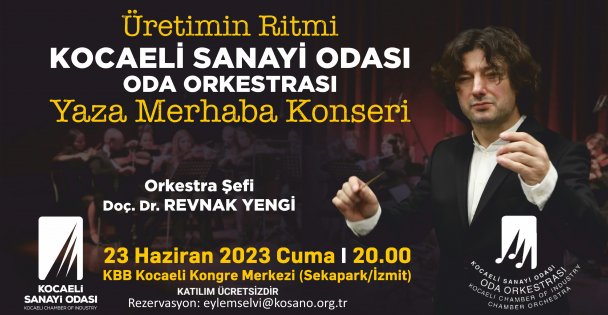 Kocaeli Sanayi Odası (KSO), 23 Haziran Cuma günü keyifli bir etkinliğe ev sahipliği yapacak. KSO Oda Orkestrası, ‘Odamızın 34. Yılı ve Yaza Merhaba Konseri’ düzenliyor. Şef Doç. Dr. Revnak Yengi yönetiminde gerçekleşecek konser etkinliği İzmit Sekapark’ta bulunan Kocaeli Kongre Merkezi’nde halka açık ve ücretsiz şekilde gerçekleştirilecek. Tüm Kocaelililerin davetli olduğu konser saat 20.00’de başlayacak, katılımcılar güzel bir yaz akşamında keyifli şarkılar dinleyerek ‘Yaza Merhaba’ diyecek. Konsere katılım için ise eylemselvi@kosano.org.tr mail adresine rezervasyon yapılması gerekmektedir.