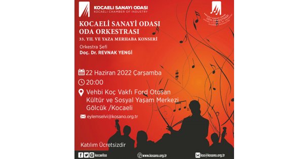 Kocaeli Sanayi Odası (KSO) kuruluşunun 33. yıl dönümü olan 22 Haziran Çarşamba günü keyifli bir etkinliğe ev sahipliği yapacak. KSO Oda Orkestrası, ‘Odamızın 33. Yılı ve Yaza Merhaba Konseri’ ile kulakların pasını silmeye hazırlanıyor. Şef Doç. Dr. Revnak Yengi yönetiminde gerçekleşecek konser etkinliği Gölcük’te bulunan Vehbi Koç Vakfı Ford Otosan Kültür ve Sosyal Yaşam Merkezi’nde düzenlenecek. Halka açık ve ücretsiz olacak konsere tüm Kocaelililer davet edildi. Konser saat 20.00’de başlayacak, katılımcılar güzel bir yaz akşamında keyifli şarkılar dinleyerek ‘Yaza Merhaba’ diyecek. Konsere katılım için ise eylemselvi@kosano.org.tr mail adresine rezervasyon yapılması gerekiyor.