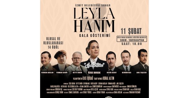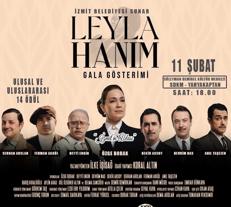İzmit Belediyesi'nin öncülüğüyle Türkiye’nin tek dereceli seçim sistemiyle seçilen ilk kadın belediye başkanı unvanına sahip Leyla Atakan’ın hayatını konu alan ‘Leyla Hanım’ belgesel filmi gala yapıyor. Gala, sürpriz konukların katılımıyla 11 Şubat Pazar günü saat 18.00’de Süleyman Demirel Kültür Merkezi’nde yapılacak. Yönetmenliğini İlke İşisağ’ın, senaryo danışmanlığını Gani Müjde’nin üstlendiği Leyla Hanım belgesel filminde Leyla Atakan’ı ünlü oyuncu Özge Borak canlandırıyor. Beyti Engin, Serhan Arslan, Bekir Aksoy, Devrim Nas, Anıl Taşezen, Barış Kıralioğlu, Belma Canciğer, Aylin Aras ve Manga grubunun solisti Ferman Akgül filmin oyuncu kadrosunda yer alıyor.