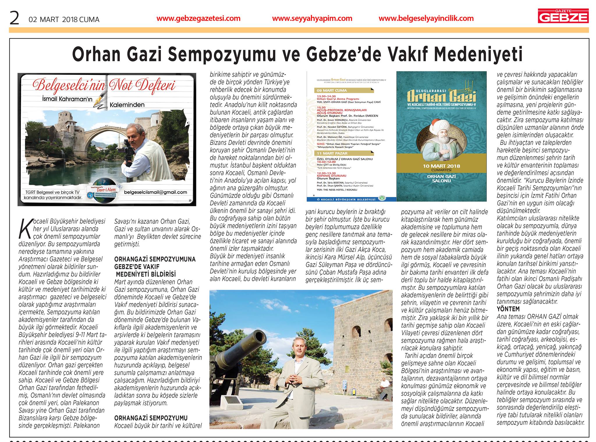 Kocaeli Büyükşehir Belediyesi her yıl Uluslararası alanda çok önemli sempozyumlar düzenliyor. Bu sempozyumlarda neredeyse tamamına yakınına Araştırmacı Gazeteci ve Belgesel yönetmeni olarak bildiriler sundum. Hazırladığımız bu bildiriler Kocaeli ve Gebze bölgesinde ki kültür ve medeniyet tarihimizde ki araştırmacı gazeteci ve belgeselci olarak yaptığımız araştırmaları içermekte, Sempozyuma katılan akademisyenler tarafından da büyük ilgi görmektedir. Kocaeli Büyükşehir belediyesi 9-11 Mart tarihleri arasında Kocaeli’nin kültür tarihinde çok önemli yeri olan Orhan Gazi ile ilgili bir sempozyum düzenliyor. Orhan gazi gerçekten Kocaeli tarihinde çok önemli yere sahip. Kocaeli ve Gebze Bölgesi Orhan Gazi tarafından fethedilmiş, Osmanlı’nın devlet olmasında çok önemli yeri, olan Palekanon Savaşı yine Orhan Gazi tarafından Bizanslılara karşı Gebze bölgesinde gerçekleşmişti. Palekanon Savaşı’nı kazanan Orhan Gazi, Gazi ve sultan unvanını alarak Osmanlı’yı Beylikten devlet sürecine getirmişti.