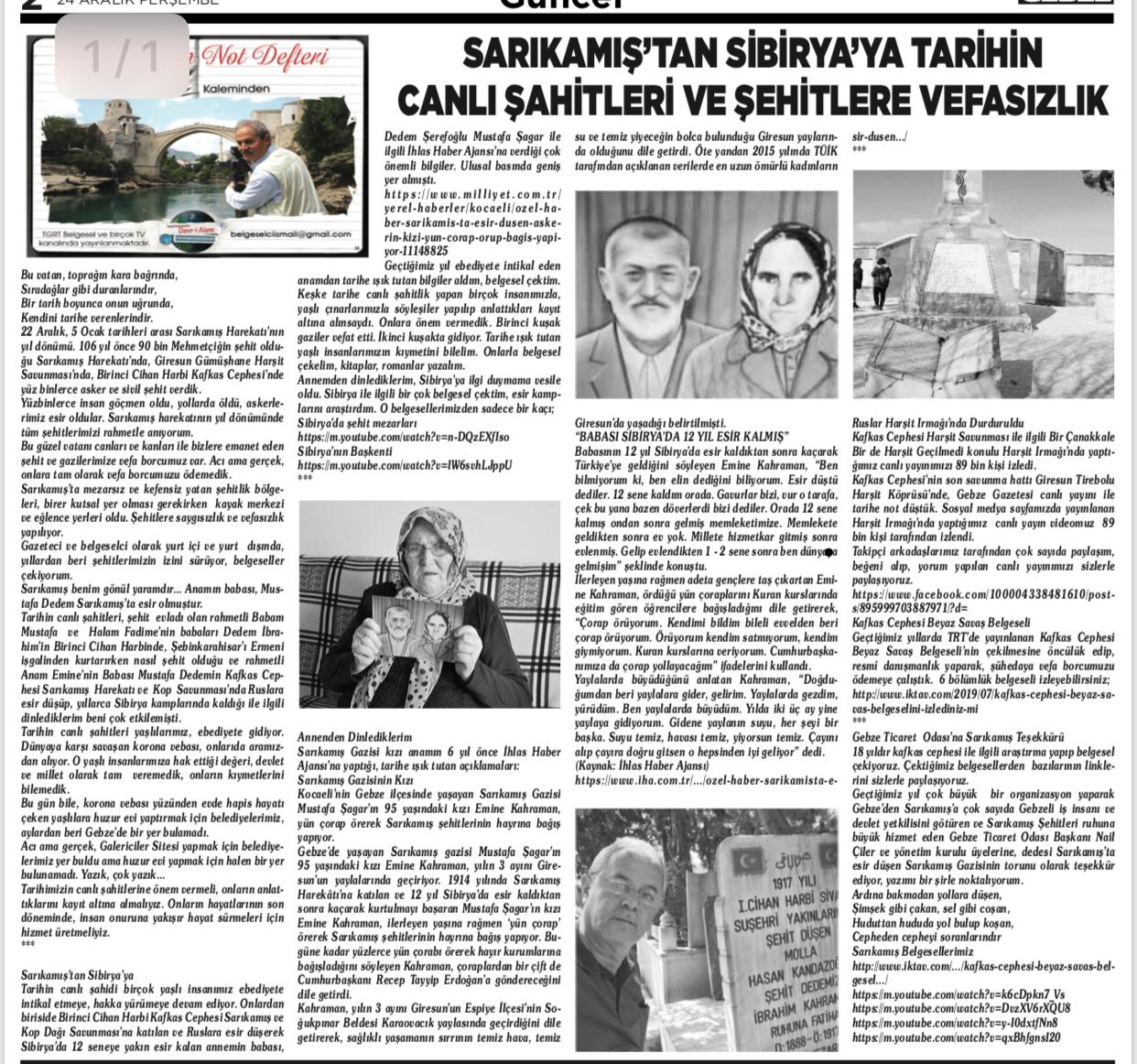 Tarihin canlı şahidi birçok yaşlı insanımız ebediyete intikal etmeye, hakka yürümeye devam ediyor. Onlardan biriside Birinci Cihan Harbi Kafkas Cephesi Sarıkamış ve Kop Dağı Savunması’na katılan ve Ruslara esir düşerek Sibirya’da 12 seneye yakın esir kalan annemin babası, Dedem Şerefoğlu Mustafa Şagar ile ilgili İhlas Haber Ajansı'na verdiği çok önemli bilgiler. Ulusal basında geniş yer almıştı.