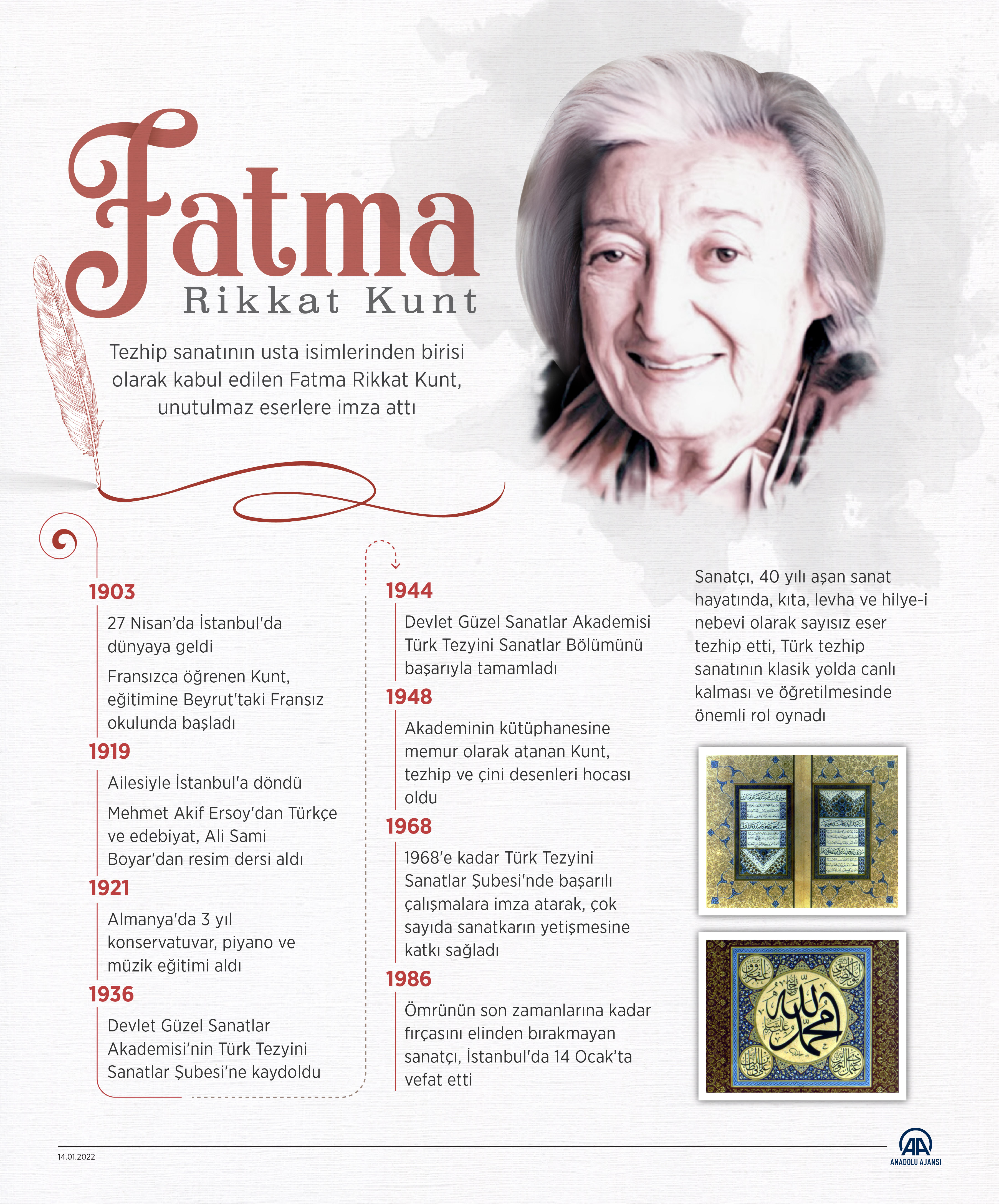 Tezhip sanatının usta isimlerinden birisi olarak kabul edilen Fatma Rikkat Kunt, unutulmaz eserlere imza attı.