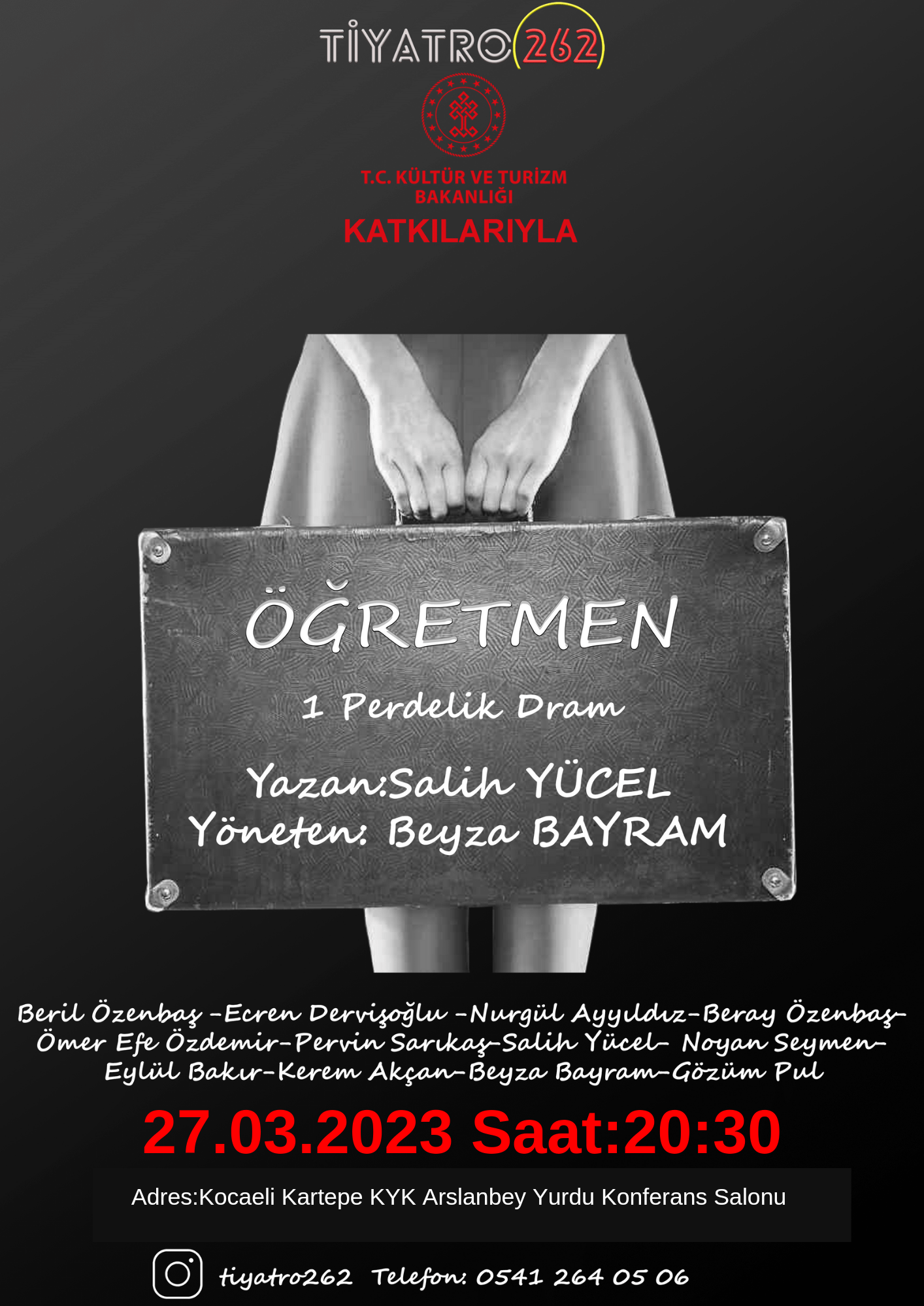 Tiyatro 262 ,27 Mart Dünya Tiyatro Günü ve Kütüphaneler Haftası münasebetiyle de 27 Mart'ta deprem bölgemizden kentimize gelen ve Arslanbey KYK yerleşkesinde konaklayan misafirlerimiz için; Öğretmen adlı oyunlarını Kültür Turizm Bakanlığı İl Kütüphaneler Müdürlüğü organizasyonunda ücretsiz olarak seyirci ile buluşturacak.