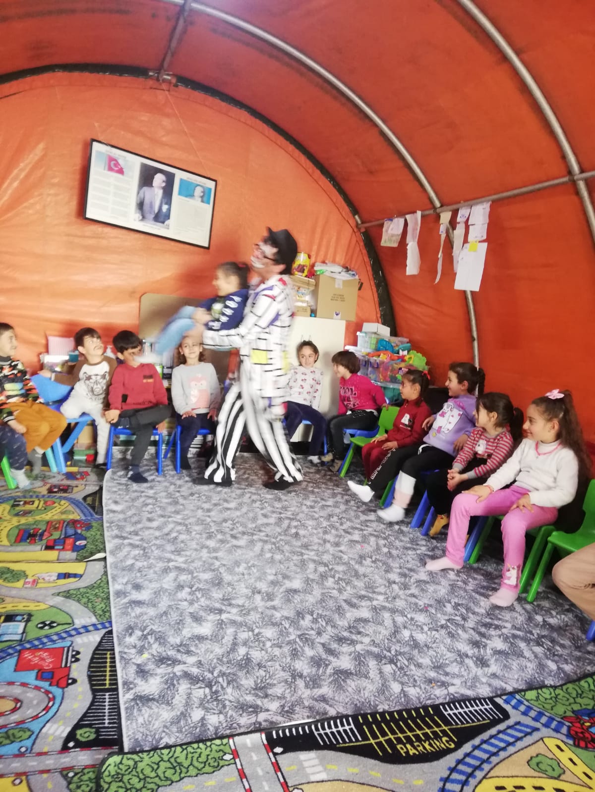 Harbiye mahallerinde bolgesel kurulmuş çadır mahhallerine giderek çocuklarla birlikte çeşitli animasyon etkinlikleri yaptı.