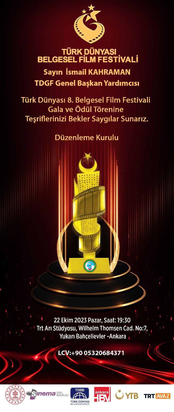 TDBFF Başkanı Mustafa Demir, Festivalin 6 Şubat Kahramanmaraş merkezli depremdeki şehitlere ithaf edildiğini belirterek, Türk dünyası 8. Belgesel Film Festivali Ödülleri 22 Ekim 2023 tarihinde pazar günü TRT Arı Stüdyolarında TRT Avaz’ın canlı yayınlayacağı ödül töreni ve gala gecesinde sahiplerini bulacaktı bilgisini aktardı.