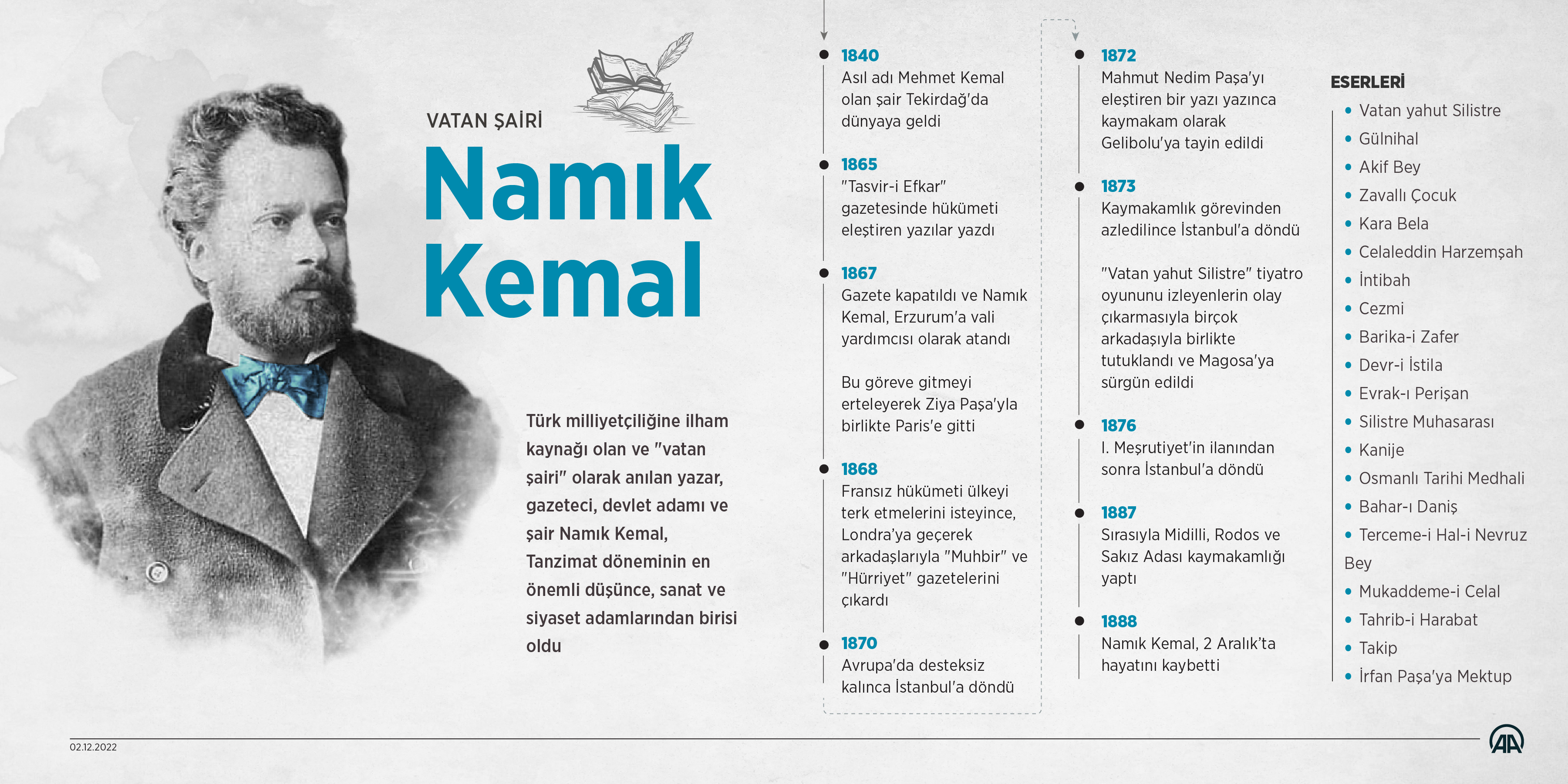 Türk milliyetçiliğine ilham kaynağı olan ve "vatan şairi" olarak anılan yazar, gazeteci, devlet adamı ve şair Namık Kemal, Tanzimat döneminin en önemli düşünce, sanat ve siyaset adamlarından birisi oldu.
