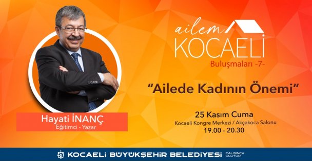 Kocaeli Büyükşehir Belediyesi “Ailem Kocaeli Buluşmaları” adı altında başlattığı söyleşilerin 7.’sinde yazar Hayati İnanç’ı konuk edecek. 25 Kasım Kadına Yönelik Şiddete Karşı Uluslararası Mücadele Günü sebebiyle Hayati İnanç, “Ailede Kadının Önemi” konu başlığı ile Kocaelililerle bir araya gelecek. Söyleşi Kocaeli Kongre Merkezinde 25 Kasım Cuma günü saat 19.30 da gerçekleşecek.