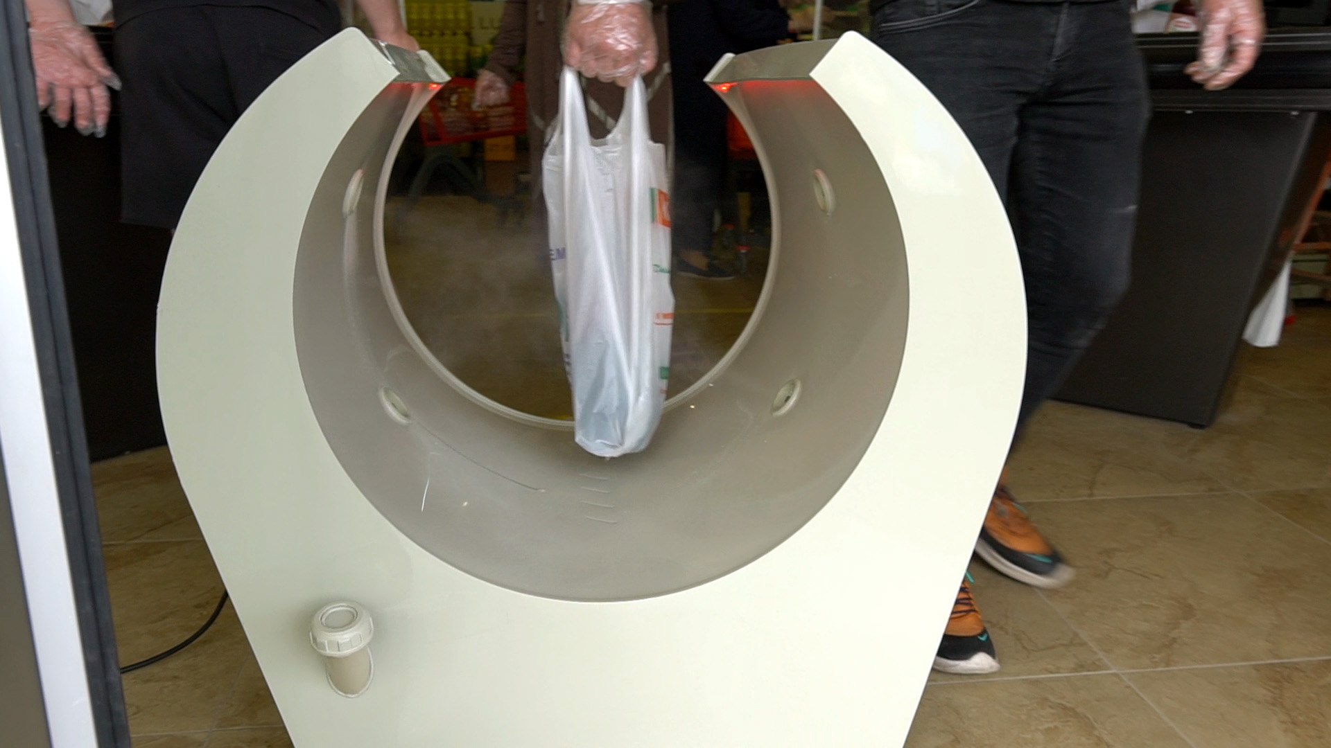 "Market çıkışında müşteriler, ellerindeki poşetleri saniyeler içerisinde hiçbir yere temas ettirmeden bu üniteden geçirerek elleri dahil poşetleri dezenfekte edebiliyor. Alışveriş poşeti dezenfektan ünitesi sadece market değil, tüm paketli ürünlerin kolayca dezenfekte edilmesini sağlayan basit ve pratik bir çözümdür."