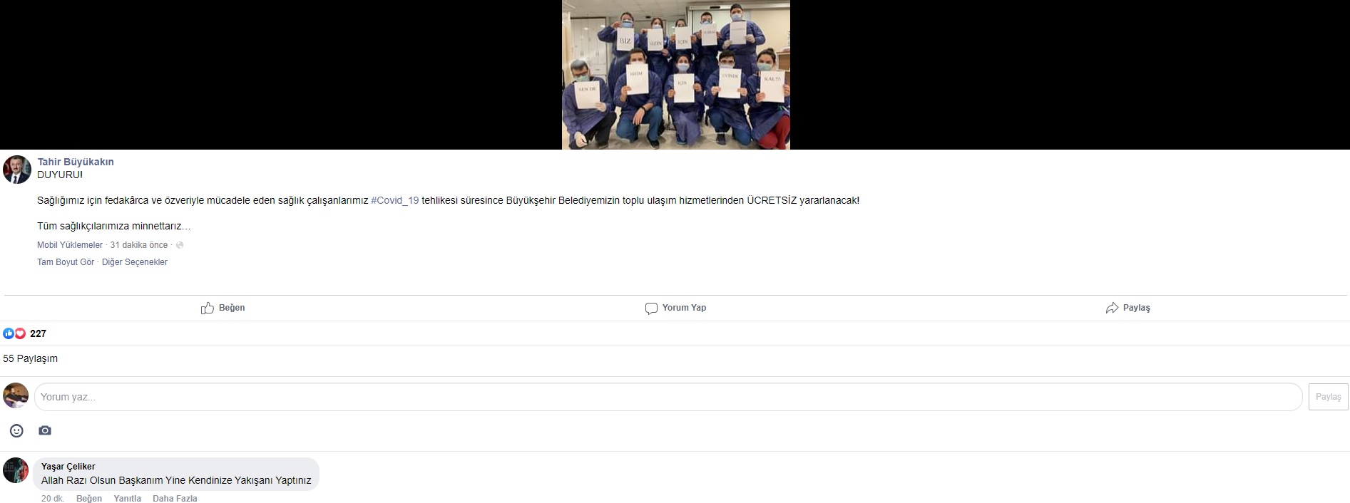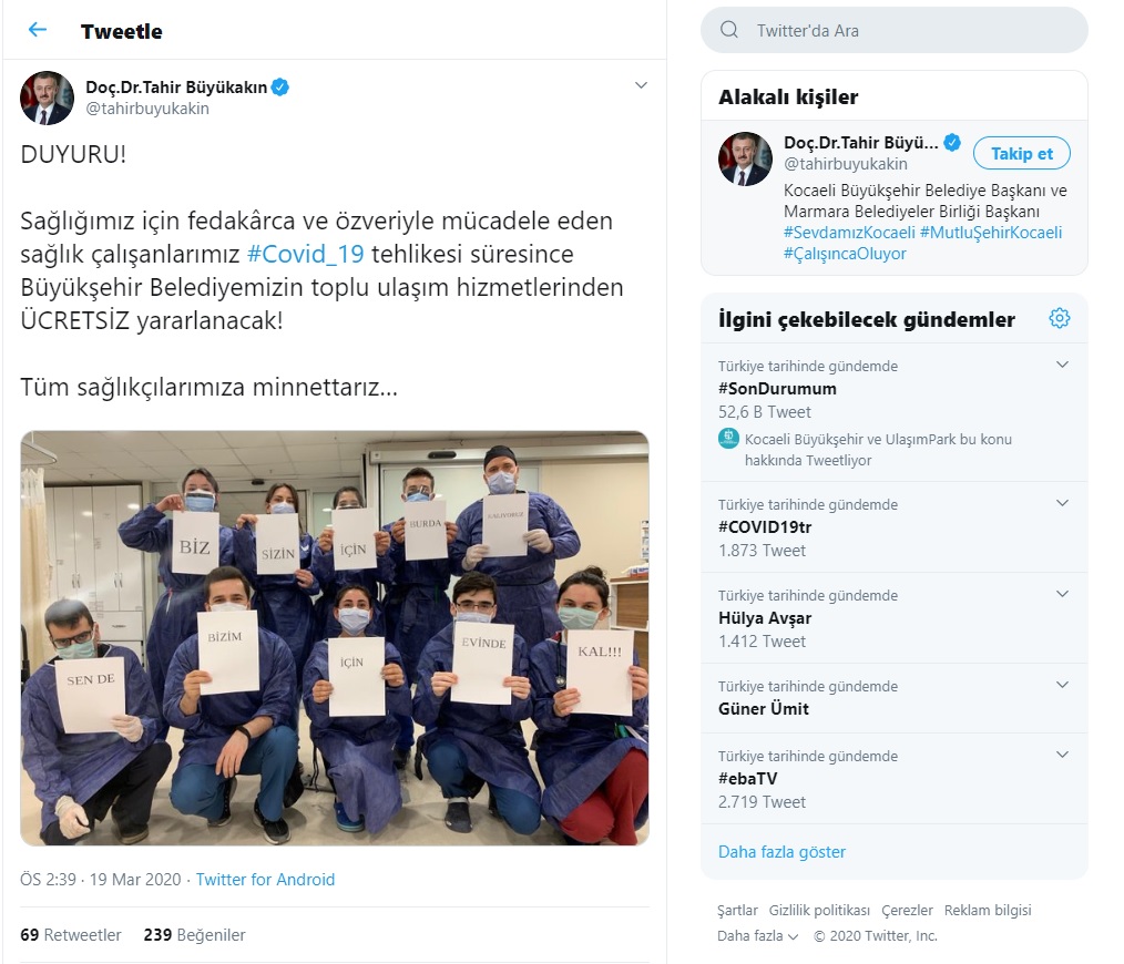 Kocaeli Büyükşehir Belediye Başkanı Doç. Dr. Tahir Büyükakın, sosyal medya resmi hesaplarından yaptığı açıklamayla koronavirüsün (Covid 19) tehlikesi süresince vatandaşların sağlığı için mücadele eden sağlık çalışanlarına Büyükşehir Belediyesi’nin toplu ulaşım hizmetlerinden ücretsiz yararlanacağını ifade etti. Başkan Büyükakın, yaptığı açıklamada şu ifadelere yer verdi, “Sağlığımız için fedakârca ve özveriyle mücadele eden sağlık çalışanlarımız #Covid_19 tehlikesi süresince Büyükşehir Belediyemizin toplu ulaşım hizmetlerinden ücretsiz yararlanacak. Tüm sağlıkçılarımıza minnettarız.”