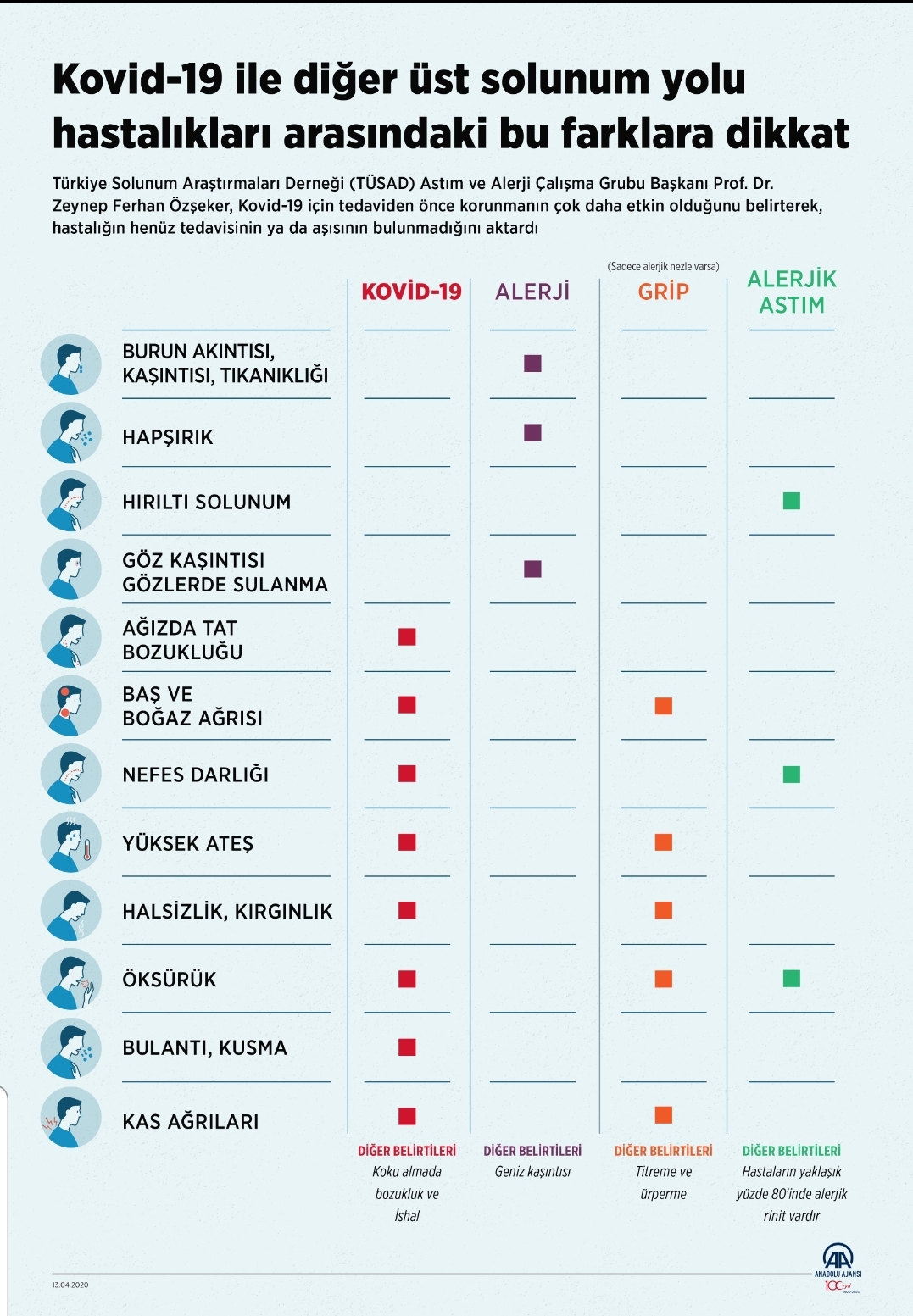 Türkiye Solunum Araştırmaları Derneği (TÜSAD) Astım ve Alerji Çalışma Grubu Başkanı Prof. Dr. Zeynep Ferhan Özşeker, Kovid-19 için tedaviden önce korunmanın çok daha etkin olduğunu belirterek, hastalığın henüz tedavisinin ya da aşısının bulunmadığını aktardı. 5Y-2124010513-04-2020 12:15 İstanbul Bülten GenelInternet Kategori Genel Sağlık Kovid-19 ile diğer üst solunum yolu hastalıkları arasındaki bu farklara dikkat 1 Türkiye Solunum Araştırmaları Derneği (TÜSAD) Astım ve Alerji Çalışma Grubu Başkanı Prof. Dr. Zeynep Ferhan Özşeker, Kovid-19 için tedaviden önce korunmanın çok daha etkin olduğunu belirterek, hastalığın henüz tedavisinin ya da aşısının bulunmadığını aktardı.