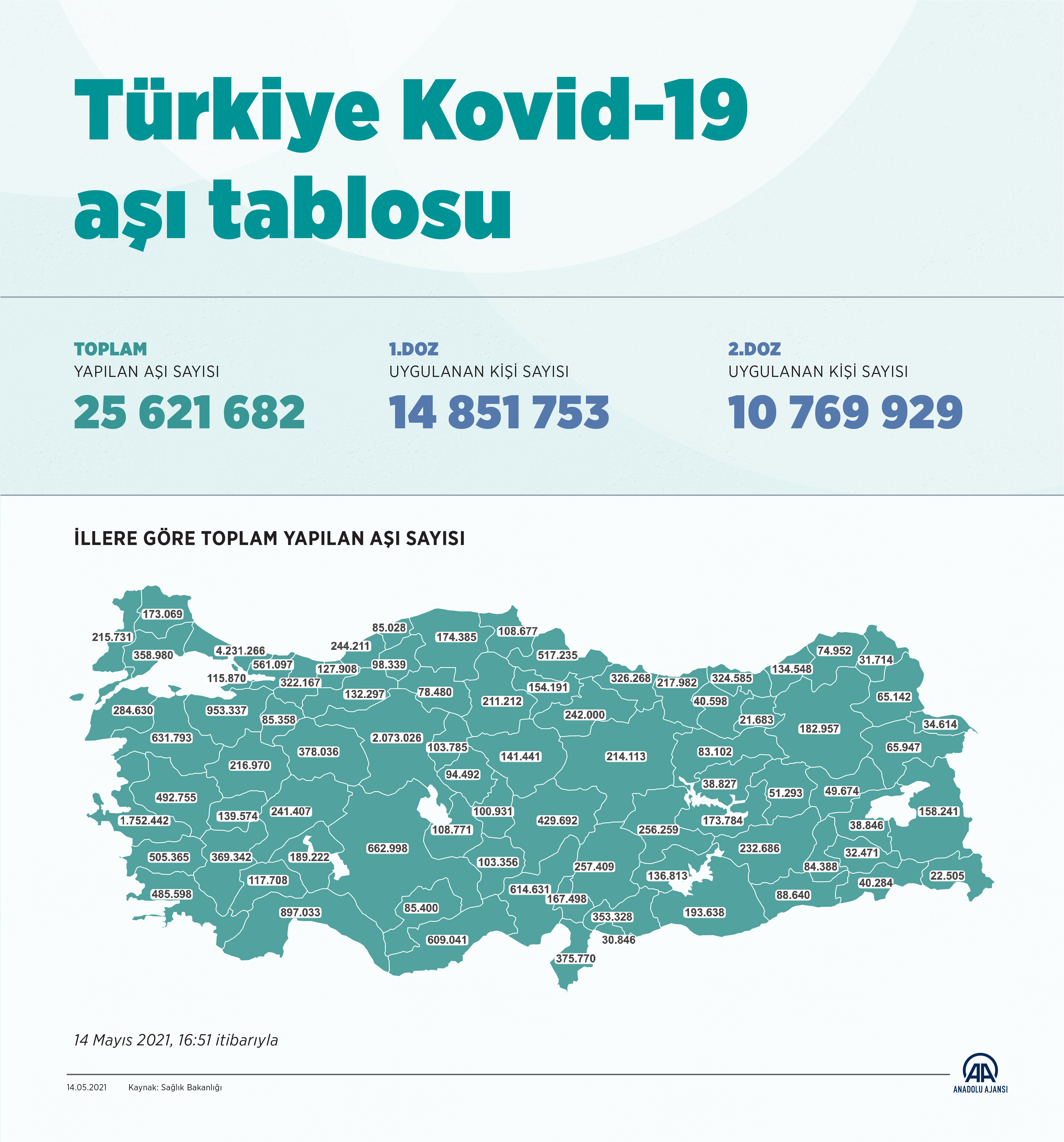 Türkiye'de bugüne kadar 25 milyon 621 bin 682 doz Kovid-19 aşısı yapıldı. 14 milyon 851 bin 753 kişiye ilk doz, 10 milyon 769 bin 929 kişiye de ikinci doz aşılar uygulandı.