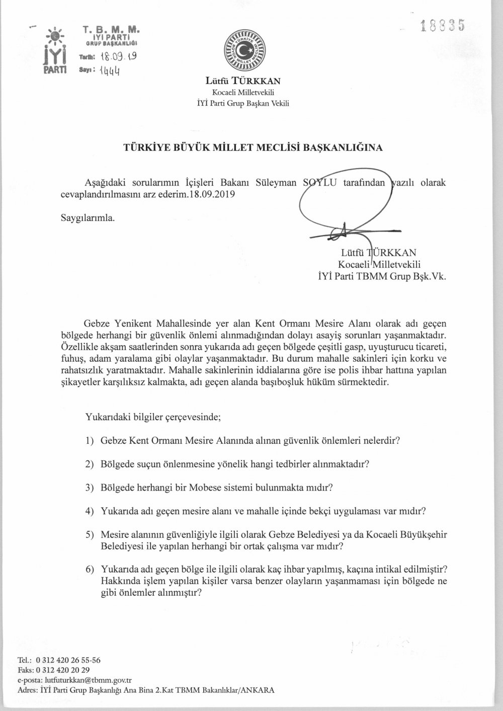İYİ Partili Türkkan İçişleri Bakanı Süleyman Soylu’nun yanıtlaması isteğiyle 18 Eylül 2019’da verdiği soru önergesinde; buradaki güvenlik sorunlarını dilegetirdiğini, bölgedeki vatandaşların can güvenliğine ilişkin endişeleri vurguladığını belirtti.