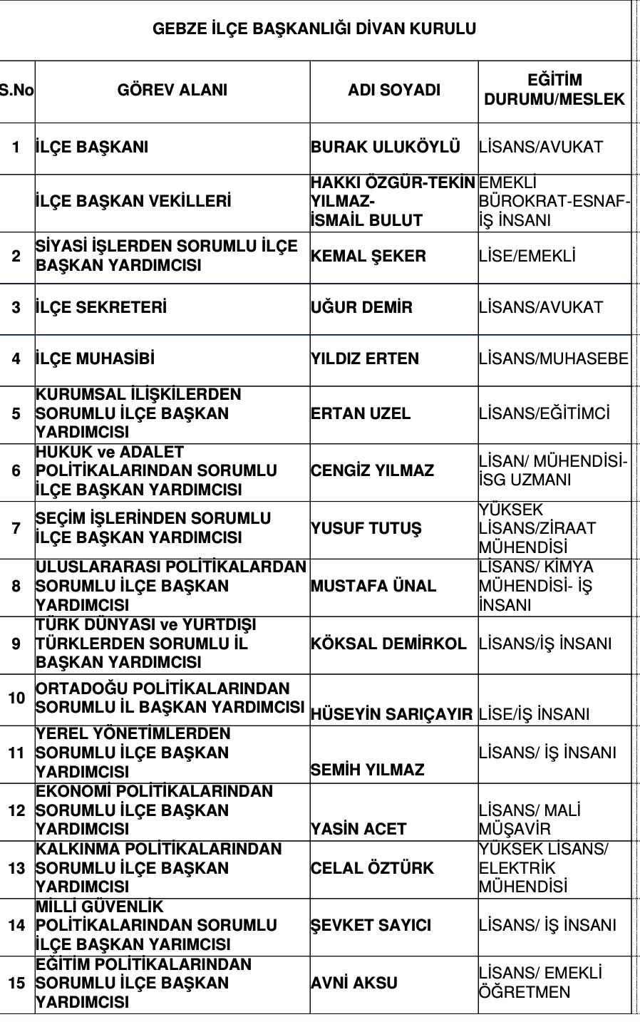 Gebze'de Divan Kurulu Netlik KazandıİYİ Parti Gebze'de divan kurulu netlik kazandı. Geçtiğimiz günlerde gerçekleşen kongre sonrasında göreve kaldığı yerden devam eden İYİ Parti Gebze İlçe Başkanı Av. Burak Uluköylü, ilçe yönetimindeki görevlendirmeleri de kamuoyuna açıkladı. 08 Aralık 2022 Perşembe 12:23 Facebook'ta Paylaş Tweetle Google+ Paylaş