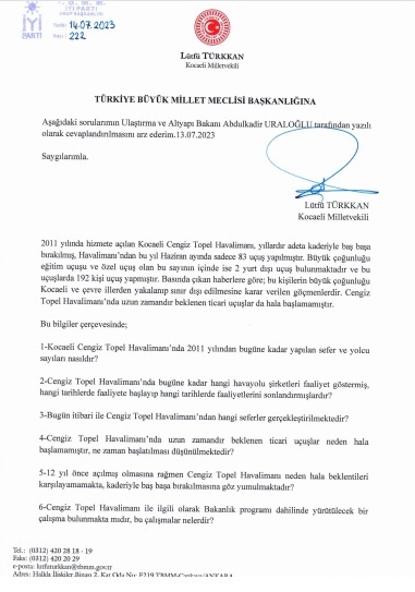 İYİ Parti Kocaeli Milletvekili Lütfü Türkkan, yolcusu olmayan havalimanını Ulaştırma ve Altyapı Bakanı Abdulkadir Uraloğlu’na sordu. Türkkan, Bakan Uraloğlu’nun cevaplaması için soru önergesi verdi.