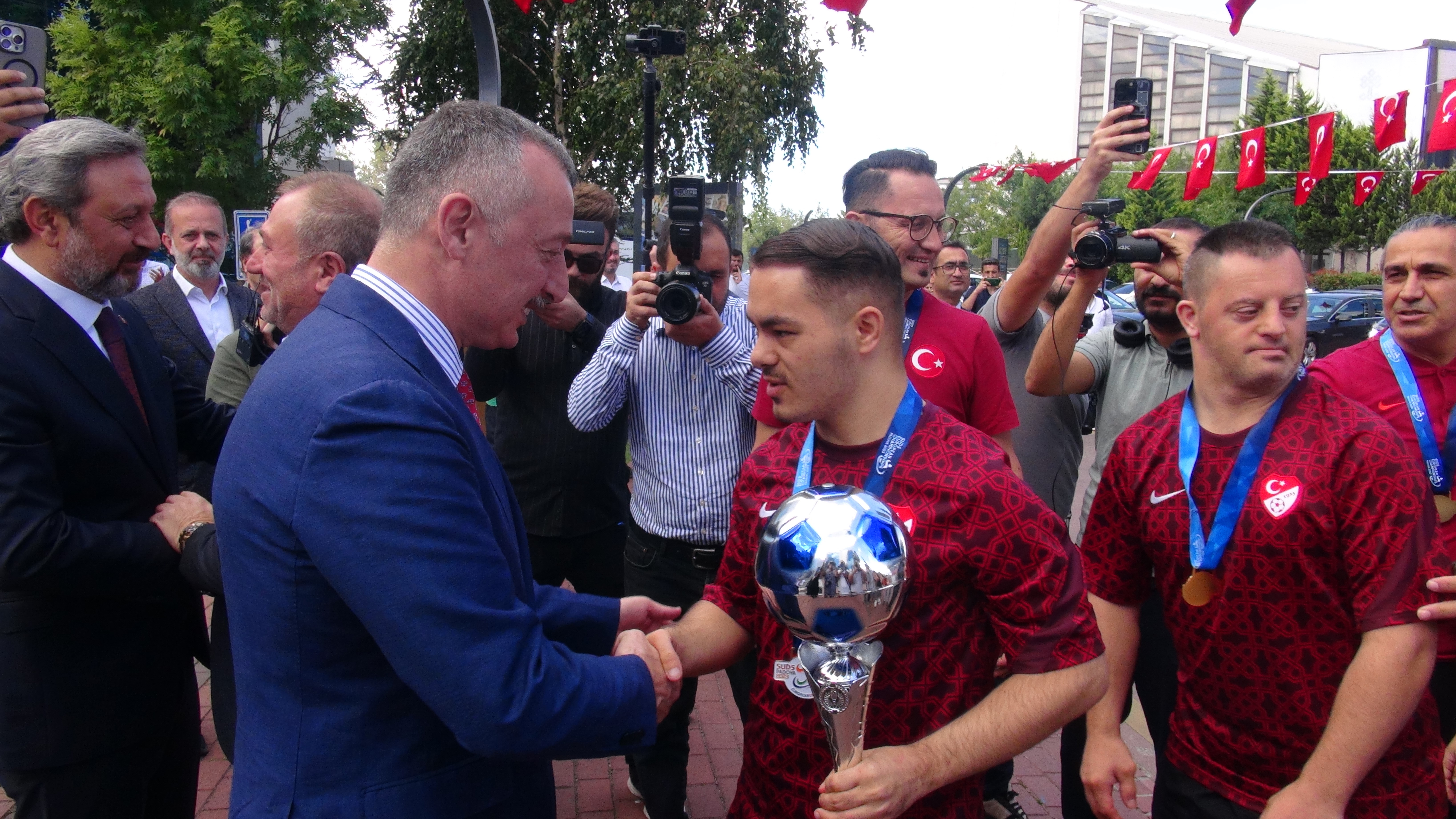 Down Sendromlu Futsal Milli Takımı, Avrupa Şampiyonası'nın finalinde Portekiz'i 2-1 mağlup ederek şampiyonluğa ulaşmıştı. Başarılı sporcular, kendilerine maddi ve manevi destekte bulunan Kocaeli Büyükşehir Belediye Başkanı Tahir Büyükakın'ı ziyaret etti. Ellerindeki kupa ile şehre gelen milli takım, büyükşehir Belediyesi önünde coşkuyla karşılandı. Protokol temsilcileri, sporcular ve vatandaşların katıldığı kutlama programında, mehter ve bando takımları da hazır bulundu.