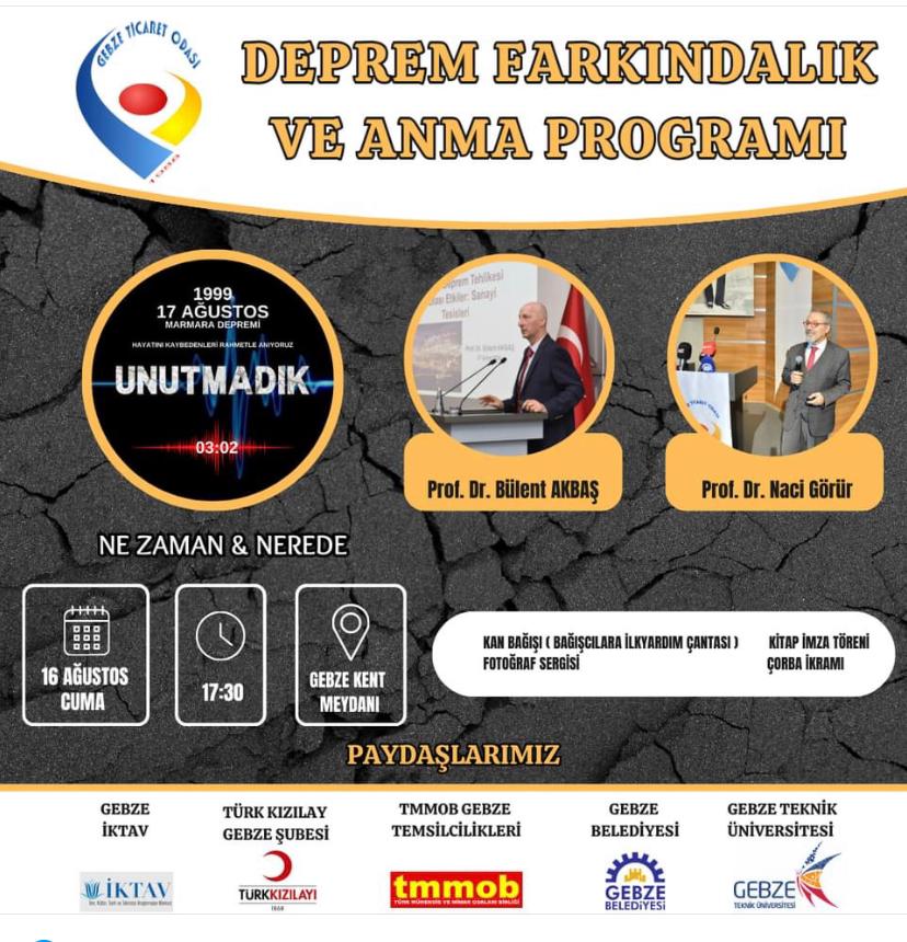 “..Gebze Ticaret Odası öncülüğünde Gebze Teknik Üniversitesi, Gebze Belediyesi, Türk Mühendis ve Mimar Odaları Birliği Gebze Temsilcilikleri, Türk Kızılay Gebze Şubesi ve Gebze İKTAV paydaşlığında Gebze Kent Meydanı’nda düzenlediğimiz “Deprem Farkındalık ve Anma Programı” konulu panelde Prof. Dr. Naci Görür ve Prof. Dr. Bülent Akbaş depremle ilgili görüşlerini Gebze halkıyla paylaştı. #1999marmaradepremi @gtuedutr @gebze_belediyesi @tmmob1954 @kizilay @gebzeticodasi @tobbiletisim..”