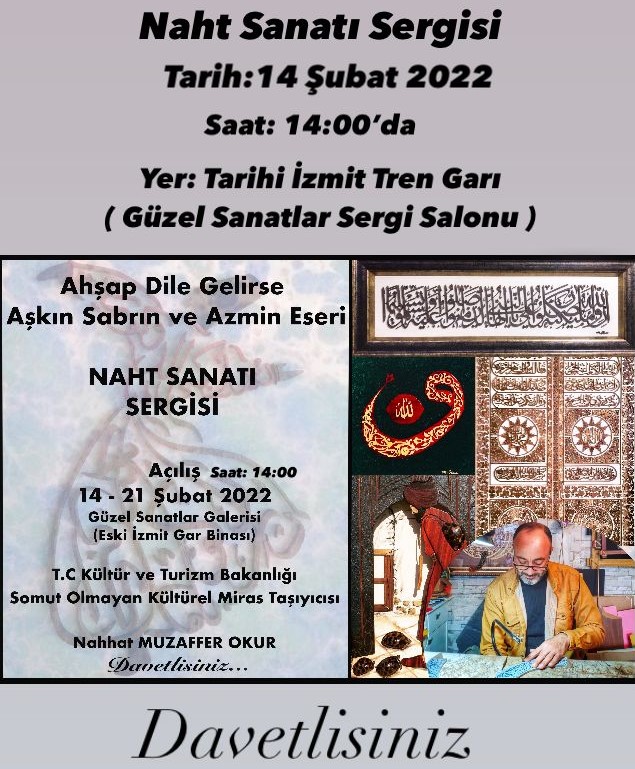 14 Şubat Pazartesi Günü Saat: 14.00'de İzmit Tarihi Tren Garı Güzel Sanatlar Sergi Salonu'nda gerçekleşecek olan Bakanlığımız Somut Olmayan Kültürel Miras Taşıyıcısı Nahhat Muzaffer Okur'un eserlerinin yer aldığı 'Ahşap Dile Gelirse' konulu Naht Sanatı Sergisine davetlisiniz.