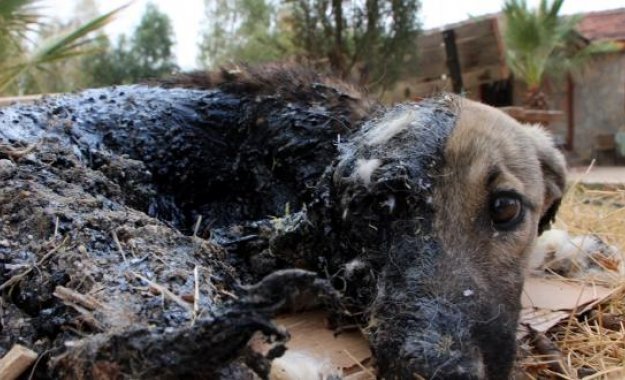 Muğla'nın Seydikemer ilçesinde yol kenarına sızan zifte bulanan köpek yavrusu kurtarıldı.