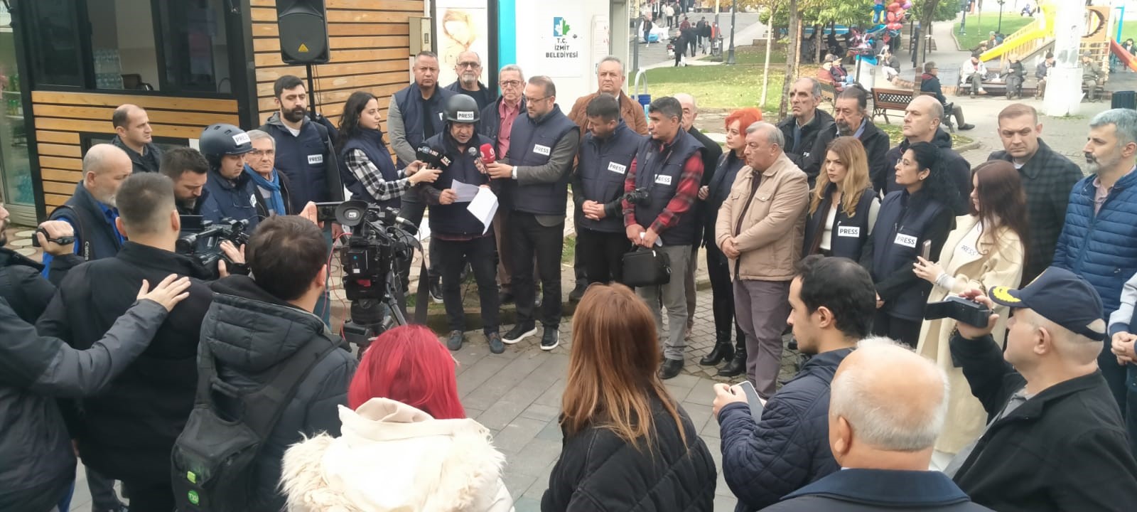 Kocaeli'de gazeteciler, İsrail'in meslektaşlarına yönelik saldırılarını protesto etti. İzmit Sabri Yalım Parkı'nda toplanan gazeteciler, "İsrail gazetecileri öldürerek gerçekleri susturamaz" yazılı pankart açtı. Gazeteciler, meslektaşlarına yönelik yapılan saldırıları protesto etmek amacıyla kamera, mikrofon ve fotoğraf makinelerini yere bıraktı. Basın açıklaması yapan Kocaeli Gazeteciler Cemiyeti (KOGACE) Yönetim Kurulu Başkanı Cemal Kaplan, "İsrail'in on yıllardır Filistin halkına yapmış olduğu zulüm, son günlerde gözlerimizin önünde yaşananla birlikte artık tahammül sınırlarını aşan duruma gelmiştir. Kadınların, çocukların, yaşlıların ve hastaların yani herhangi savaşın, çatışmanın tarafı olamayacak olanların katledildiği bu insanlık dışı saldırılara son verilmesi hepimizin en büyük arzusu ve arayışıdır. Her gün hepimiz kendimize göre bu katliamı protesto ediyor ve karşı çıkıyoruz" diye konuştu.