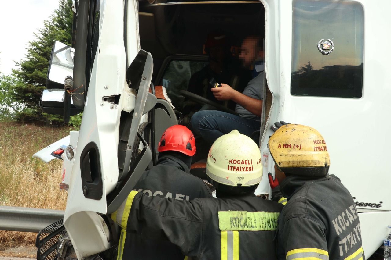 Kocaeli TEM Otoyolu'nda yavaşlayan trafikte duramayan sürücü idaresindeki tır, kamyona arkadan çarptı. Çarpmanın şiddetiyle araç içinde sıkışan tır sürücüsü, itfaiye ekipleri tarafından çıkarıldı.