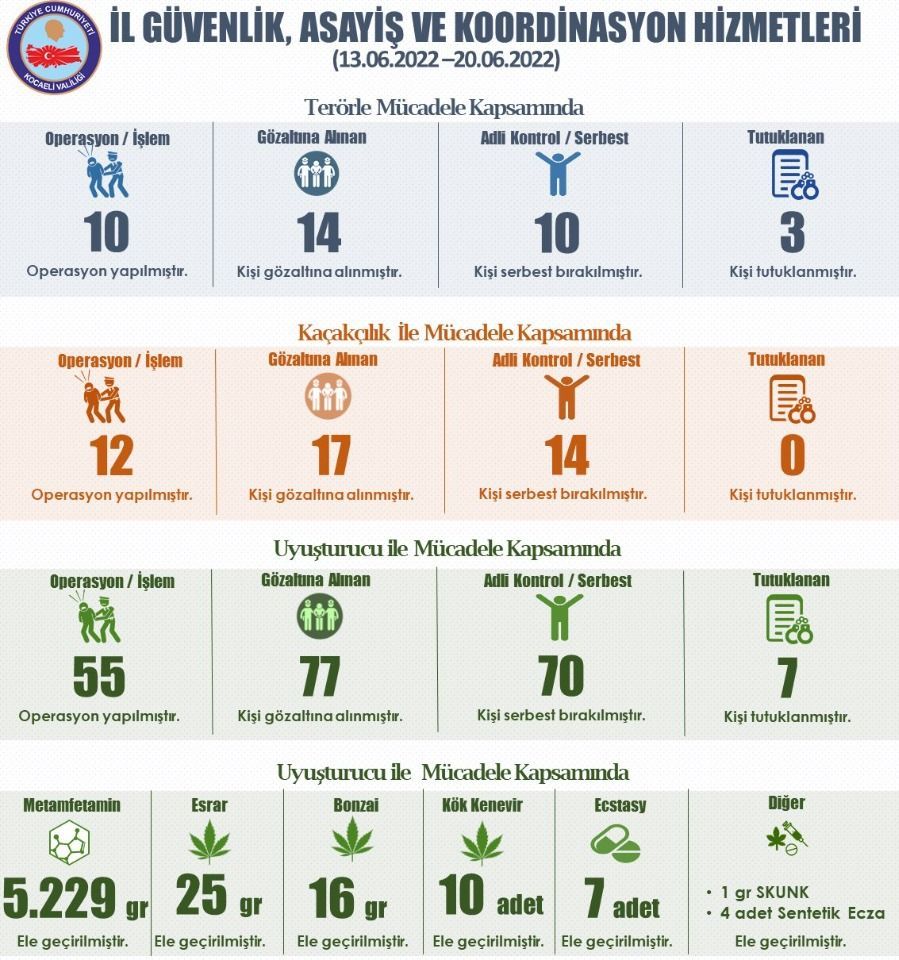 Vali Seddar Yavuz 13-20 Haziran tarihleri arasında Kocaeli'de gerçekleşen operasyonlarla ilgili açıklama yaptı. Kocaeli’de terörle mücadele kapsamında 10 operasyon düzenlendi. 14 kişinin gözaltına alındığı operasyonlarda 10 kişi serbest bırakılırken 3 kişi ise tutuklandı. Kaçakçılıkla mücadele kapsamında yapılan 12 operasyonda 17 kişi gözaltına alındı. 14 kişi tamamlanan işlemlerinin ardından serbest bırakılırken diğer şahısların işlemleri devam ediyor.