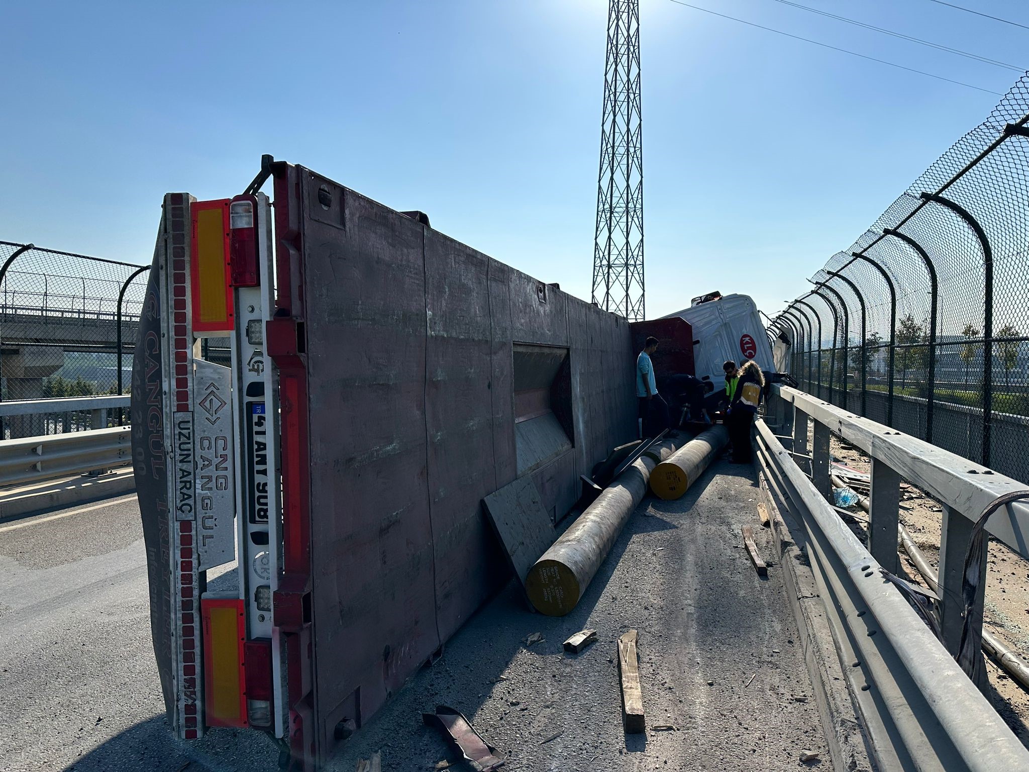 Kaza, Çayırova ilçesi TEM Otoyolu bağlantı kavşağı üst geçidinde meydana geldi. Edinilen bilgiye göre, Mevlüt T. idaresindeki 41 LK 186 plakalı Mercedes marka tır, virajı alamayarak yan yattı. Tırda yüklü olan demir direkler de yola savruldu. Kazayı gören çevredeki vatandaşlar, 112 Acil Çağrı Merkezi'ne haber verdi. İhbar üzerine olay yerine sağlık ve polis sevk edildi. Kısa sürede olay yerine gelen sağlık ekipleri, yaralı sürücüyü ambulansla hastaneye götürdü. Vinç yardımıyla tır ve demirlerin yoldan kaldırılmasıyla trafiğe kapanan yol tekrar açıldı.
