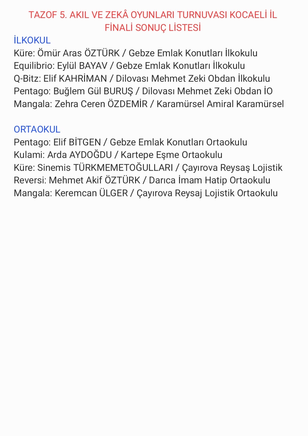 İlkokullar arası Equilibrio, Küre, Mangala, Pentago, Q- bitz; ortaokullar arası Kulami, Küre, Mangala, Reversi ve Pentago kategorisinde düzenlenen tüm akıl ve zeka oyunları turnuvası'nın Kocaeli il finali, 12 ilçeden 120 öğrencinin katılımıyla İzmit Muammer Dereli Fen lisesinde gerçekleşti. Müsabakalar, Akıl ve Zeka Oyunları i̇l koordinatörü ve turnuva komisyon başkanı Diyaeddin Ay başkanlığında gerçekleşti.