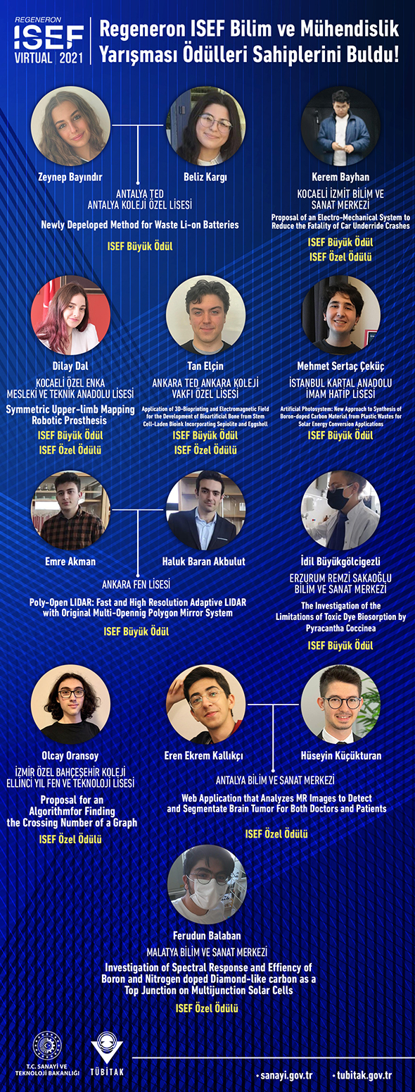 Her yıl 80’den fazla ülkeden, 1.100’ün üzerinde projeyle yaklaşık 1.800’den fazla öğrencinin katılımıyla gerçekleştirilen Regeneron ISEF Bilim ve Mühendislik Yarışması'na katılmak üzere Türkiye'yi temsilen seçilen 14 projenin sahibi 19 öğrenci arasından 6 projenin sahibi 7 öğrenci özel ödül, 7 projenin sahibi 9 öğrenci de Regeneron ISEF büyük ödülünü kazandı.