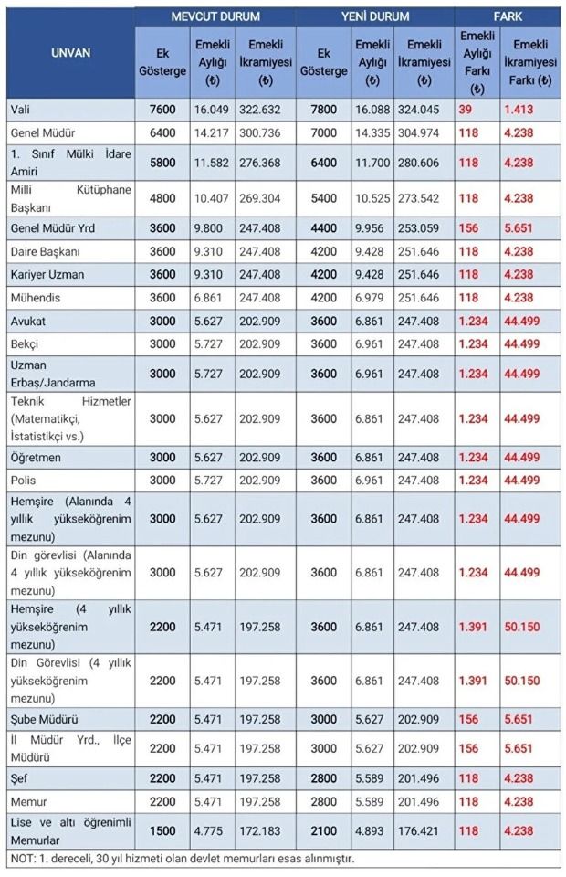 Bakanlık, birinci derece ve 30 yıl hizmeti olan devlet memurlarını esas alarak ek gösterge artışının bazı unvanların emekli aylık ve ikramiyelerine etkisine ilişkin tablo da hazırladı.