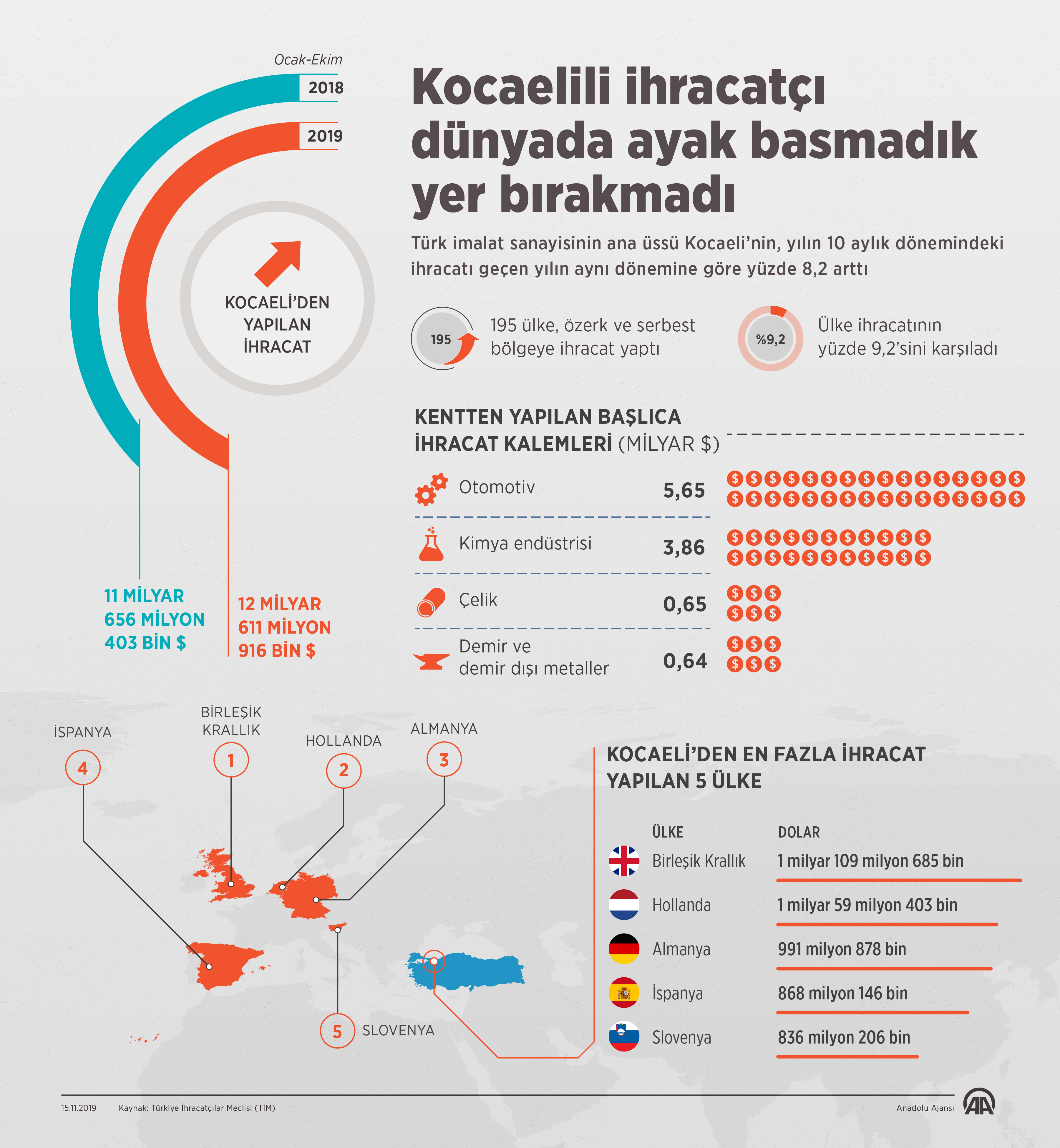 Birleşik Krallık, 1 milyar 109 milyon 685 bin dolarla ocak-ekim döneminde Kocaeli'den en fazla ihracat yapılan ülke olurken, bunu 1 milyar 59 milyon 403 bin dolarla Hollanda, 991 milyon 878 bin dolarla Almanya, 868 milyon 146 bin dolarla İspanya, 836 milyon 206 bin dolarla Slovenya izledi.